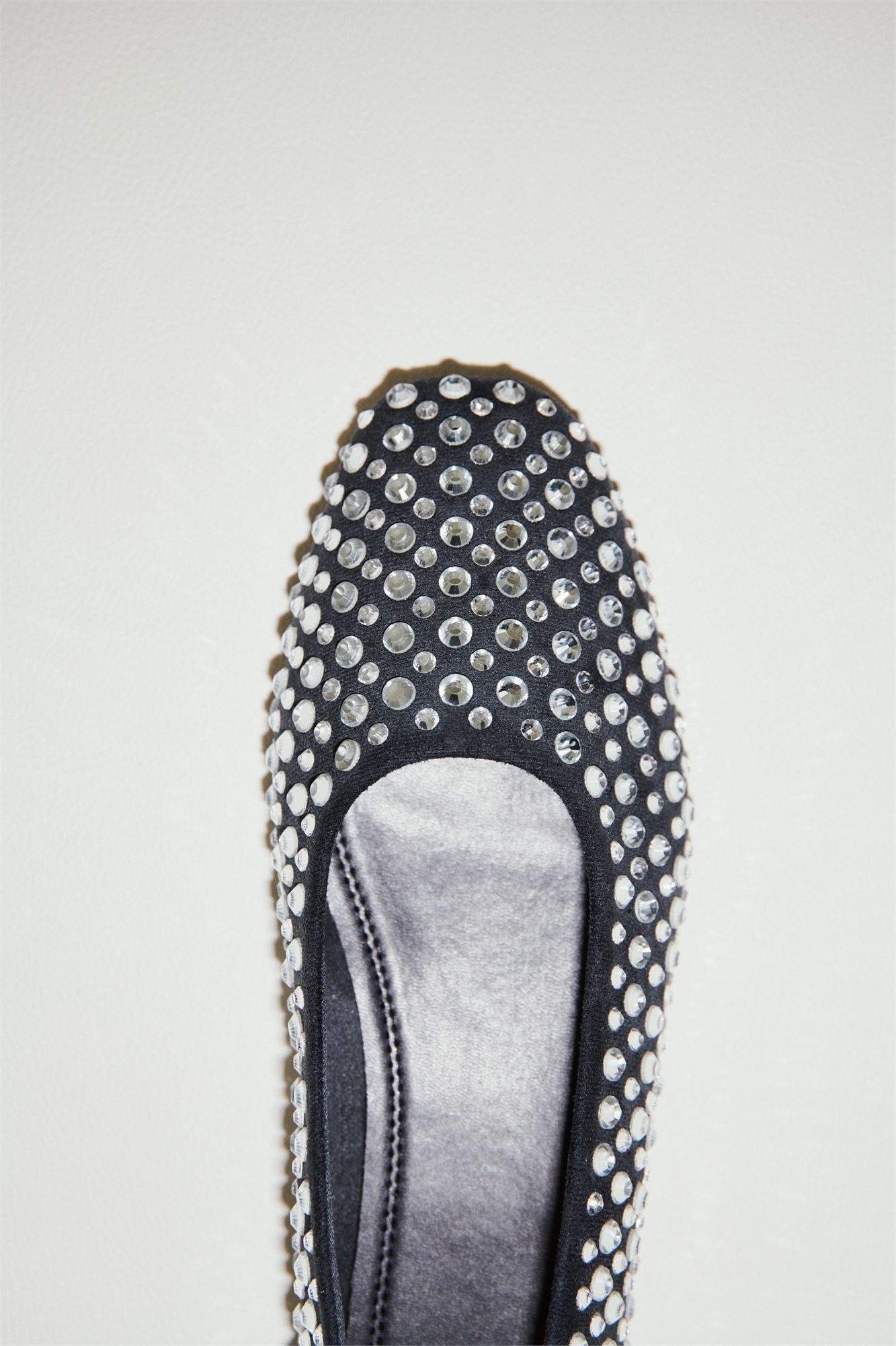 Балетки из тканого материала с миндалевидными носками, украшенными стразами. Атласная подкладка.