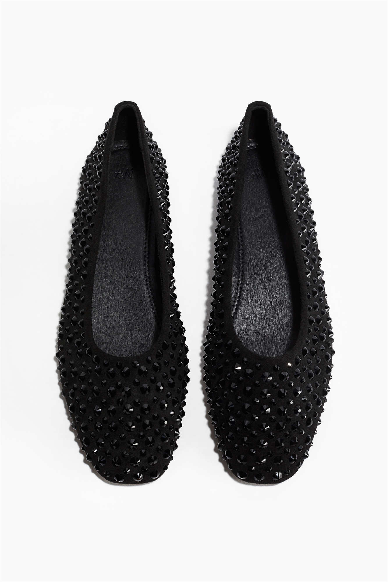 Балетки из тканого материала с миндалевидными носками, украшенными стразами. Атласная подкладка.