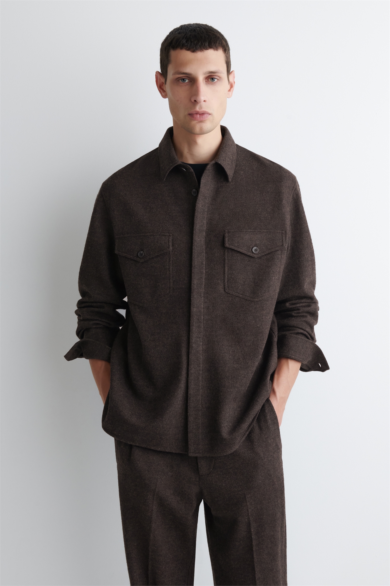 Эта рубашка цвета темного хаки - идеальный переходный вариант, ведь ее можно носить как верхнюю одежду или под пальто. Она имеет непринужденную форму, скрытую застежку, тональную строчку и заостренный воротник. Он изготовлен из смеси мериносовой шерсти и хлопка, которые проварены для придания тактильных свойств. Сочетается с брюками в тон. Свободный кройЗастежка на пуговицыВ изделии использовано шерстяное волокно Responsible Wool Standard TE-00047206 (RWS) с ферм, сертифицированных на соответствие требованиям по благополучию животных и землепользованию Состав: 57% мериносовая шерсть, 43% хлопок. Без учета отделки / Сухая чистка Длина по спинке для размера M составляет 71,1 см / Модель носит размер M