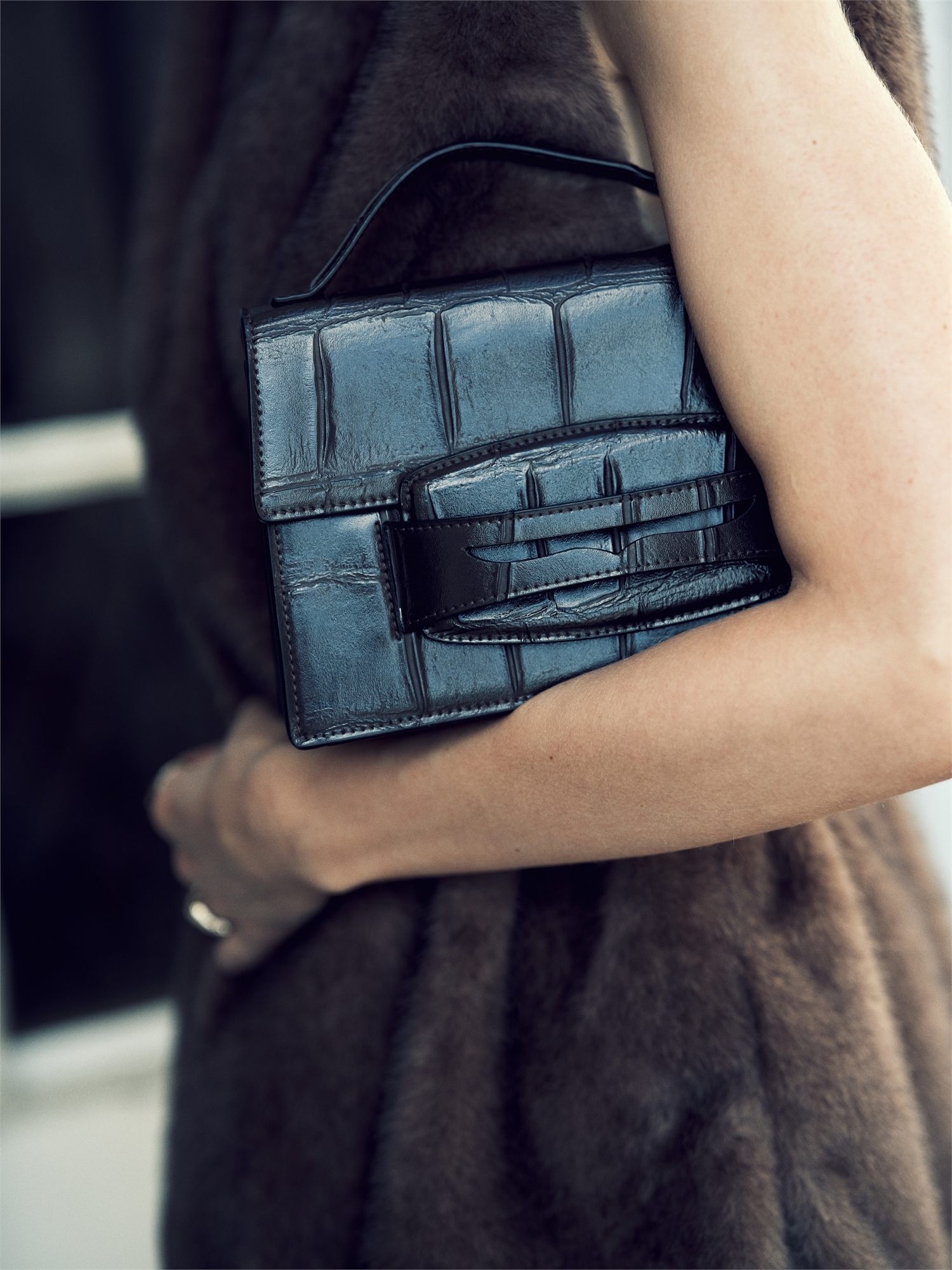 Сумка-кроссбоди с клапаном, ручкой сверху и застежкой-защелкой спереди. Регулируемый плечевой ремень. На подкладке.