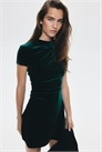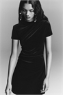Короткое приталенное платье с круглым вырезом и короткими рукавами. Складки на одном плече и на противоположной стороне талии создают эффект драпировки.