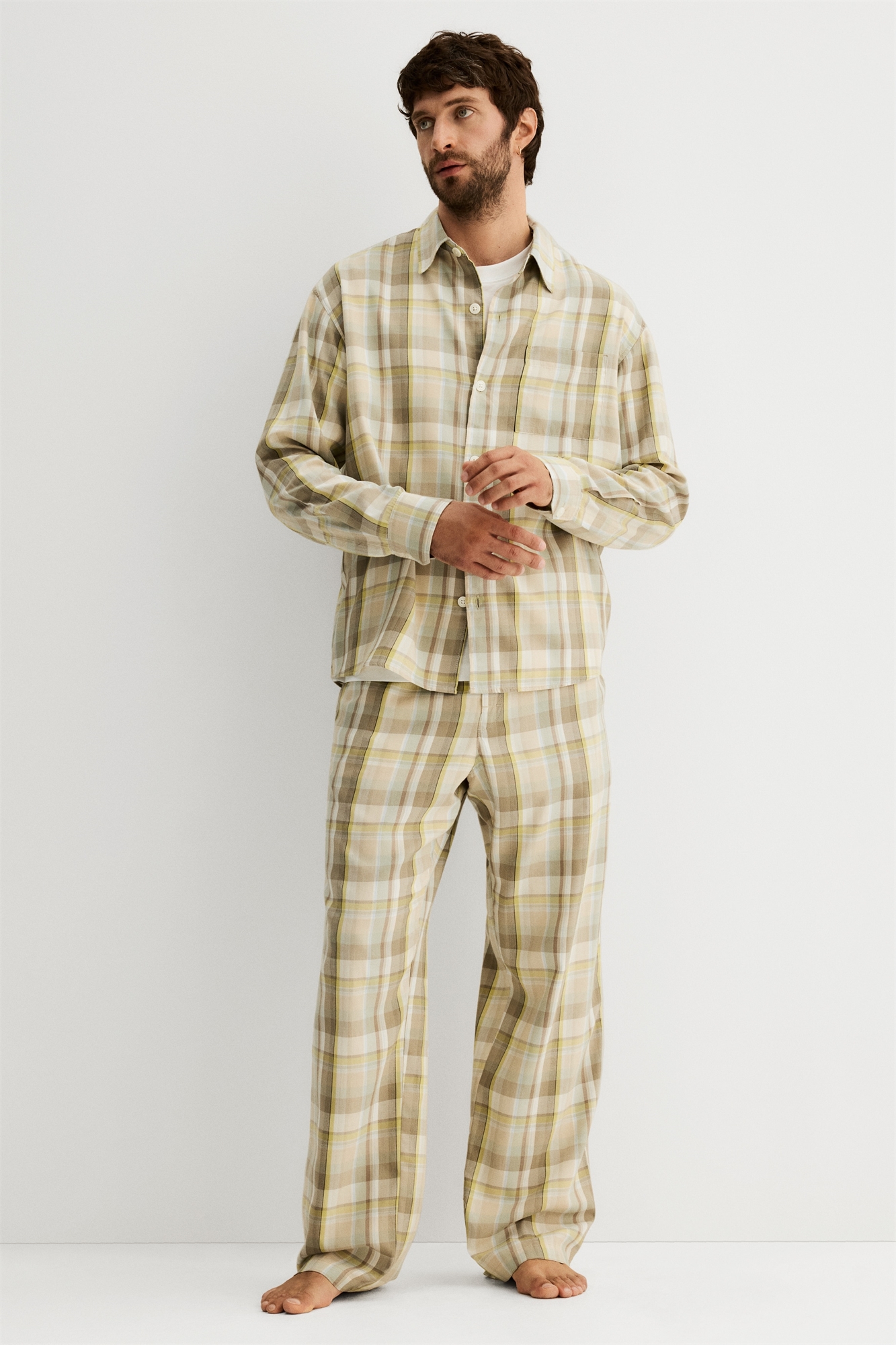 Пижама с рубашкой и нижними штанишками из мягкого хлопкового бленда. Рубашка с длинными рукавами, воротником, пуговицами спереди и накладным нагрудным карманом. Нижние штанишки с эластичным поясом и потайным шнурком, украшенным декоративной пуговицей.