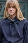 Блузка из джинсовой ткани с отложным воротником и завязками спереди, которые можно завязать в бант. Пуговицы спереди, плечевые швы, направленные вперед, и задний карман. Длинные рукава с манжетами на пуговицах и рукавной планкой с пуговицей.