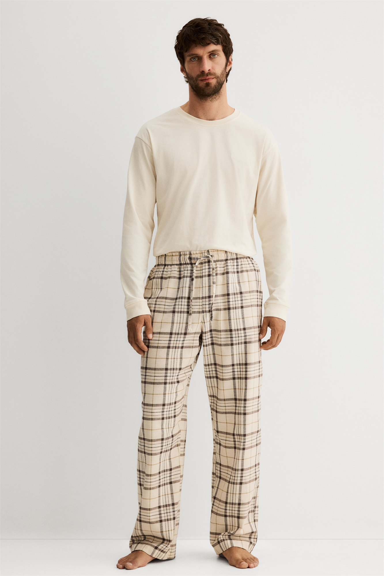 Пижама с верхом из хлопкового джерси и низом из хлопковой фланели. Верхняя часть с круглым вырезом, слегка спущенными плечами, вышитой деталью на груди и длинными рукавами с обрезанными манжетами. Низ с эластичной отделкой и завязками на талии, фальшивой ширинкой, диагональными боковыми карманами и прямыми ногами.