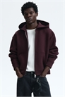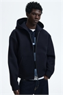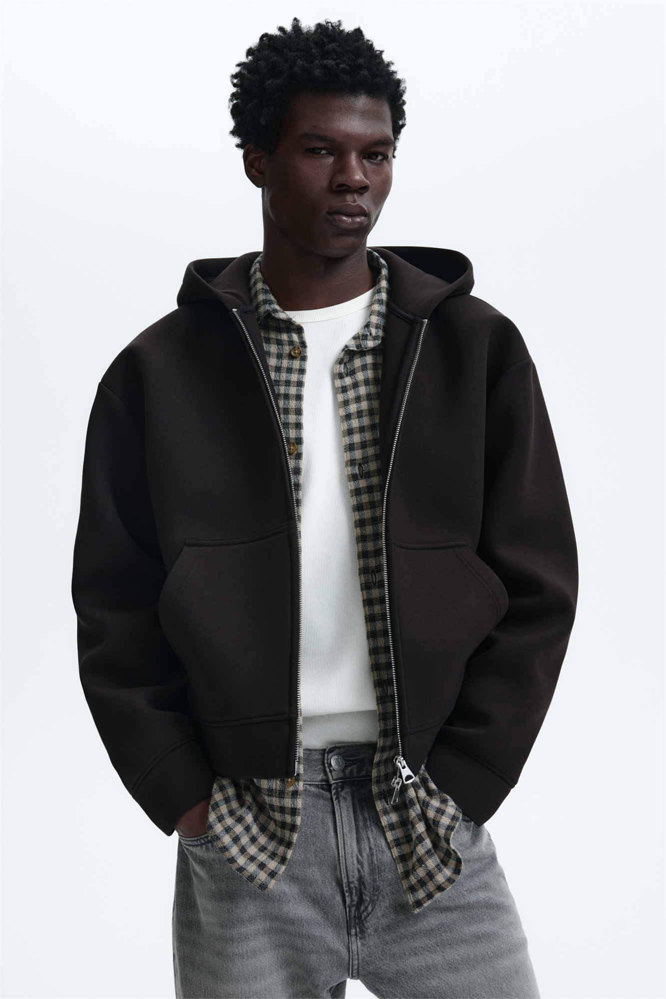 Толстовка на молнии в боксерском стиле из ткани скуба с капюшоном на подкладке, застежкой-молнией спереди, спущенными плечами и открытыми передними карманами. Свободный крой для пышного, но не слишком большого силуэта.