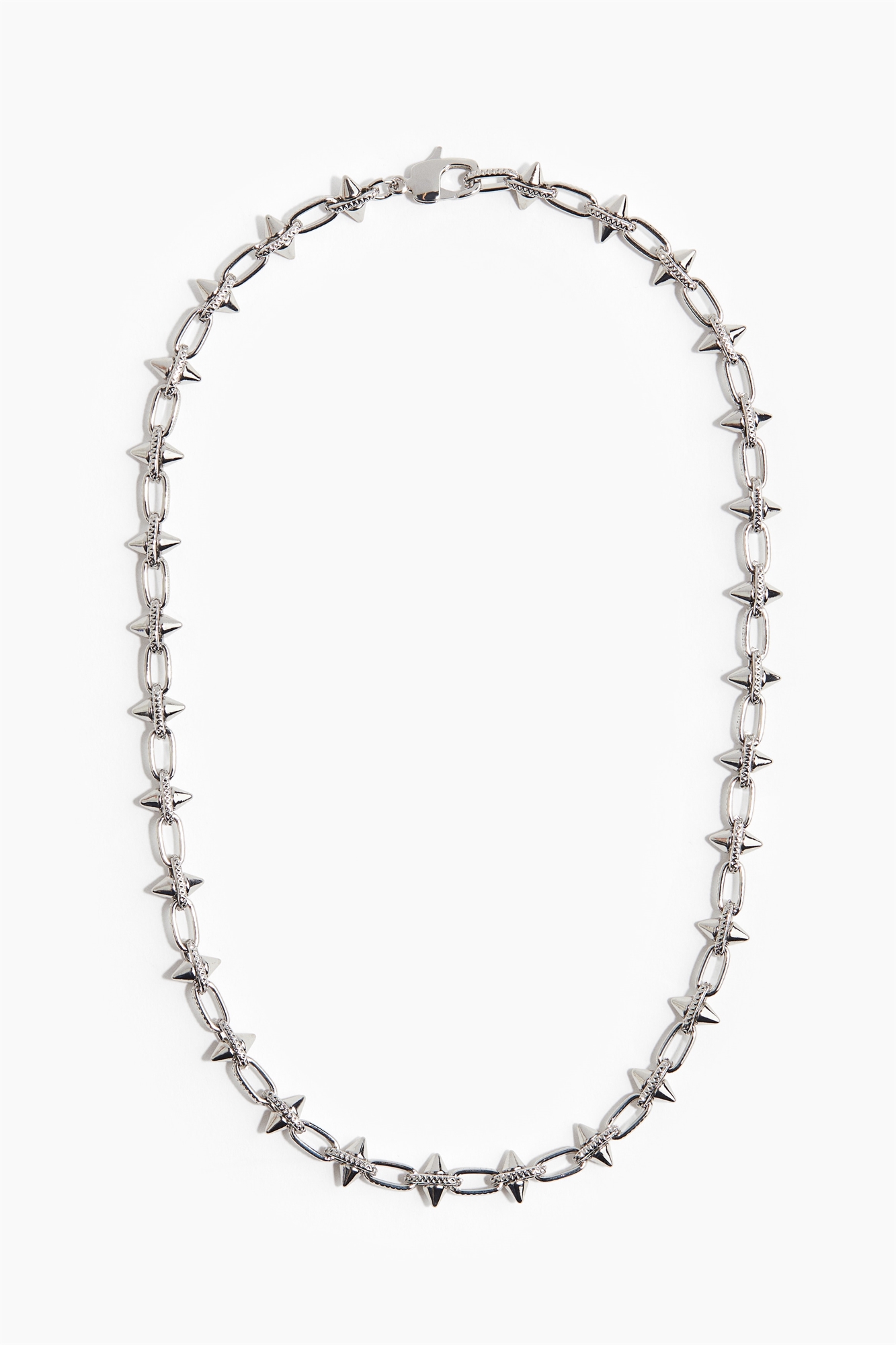 Металлическое ожерелье с деталями в виде шипов и застежкой-триггером.