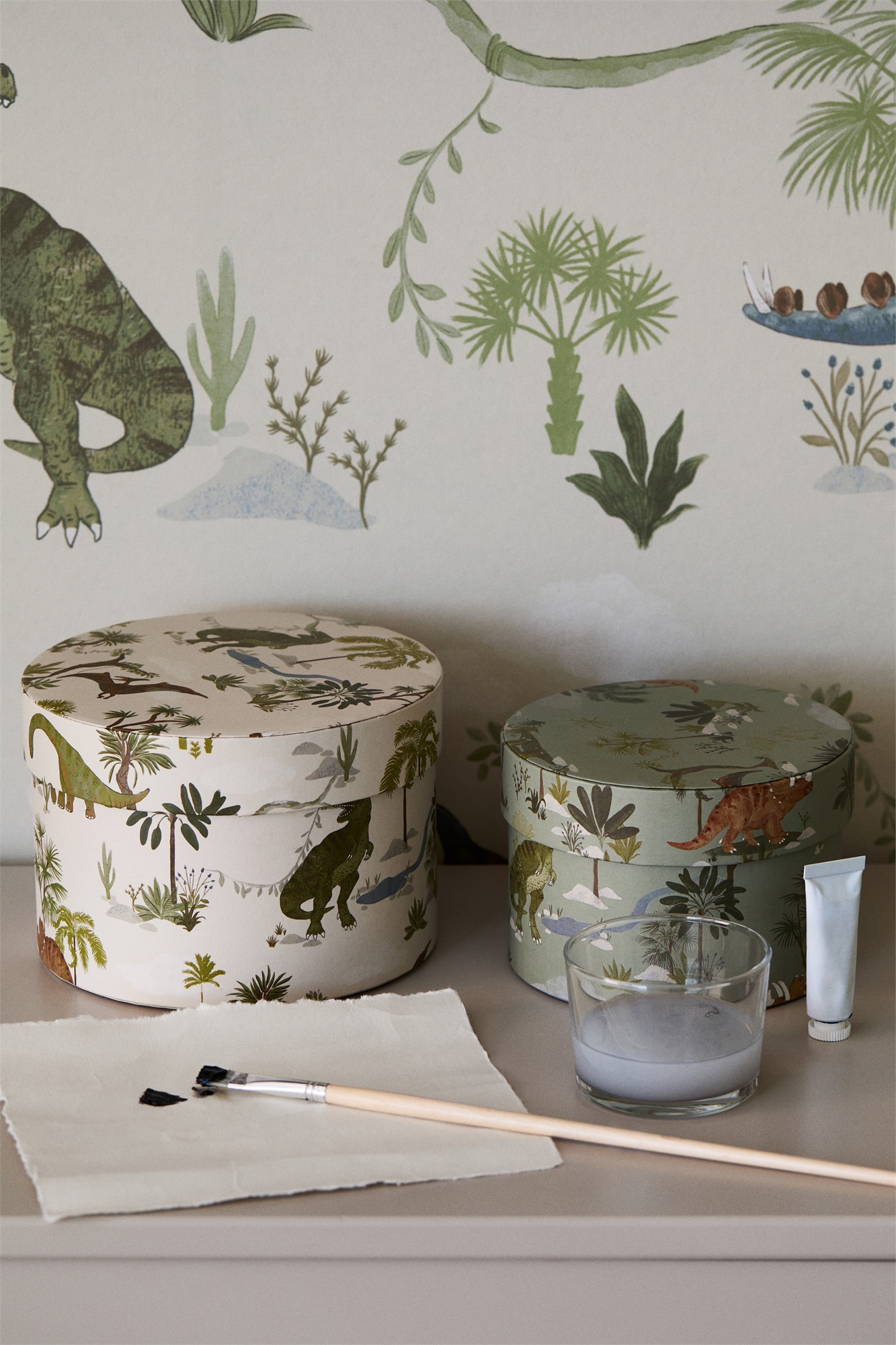 Набор округлых коробок для хранения разного размера с подходящими крышками. Коробки изготовлены из картона с ярким рисунком по всей поверхности. Высота меньшей коробки 10 см. Диаметр 14 см. Высота большей коробки 12 см. Диаметр 18 см.