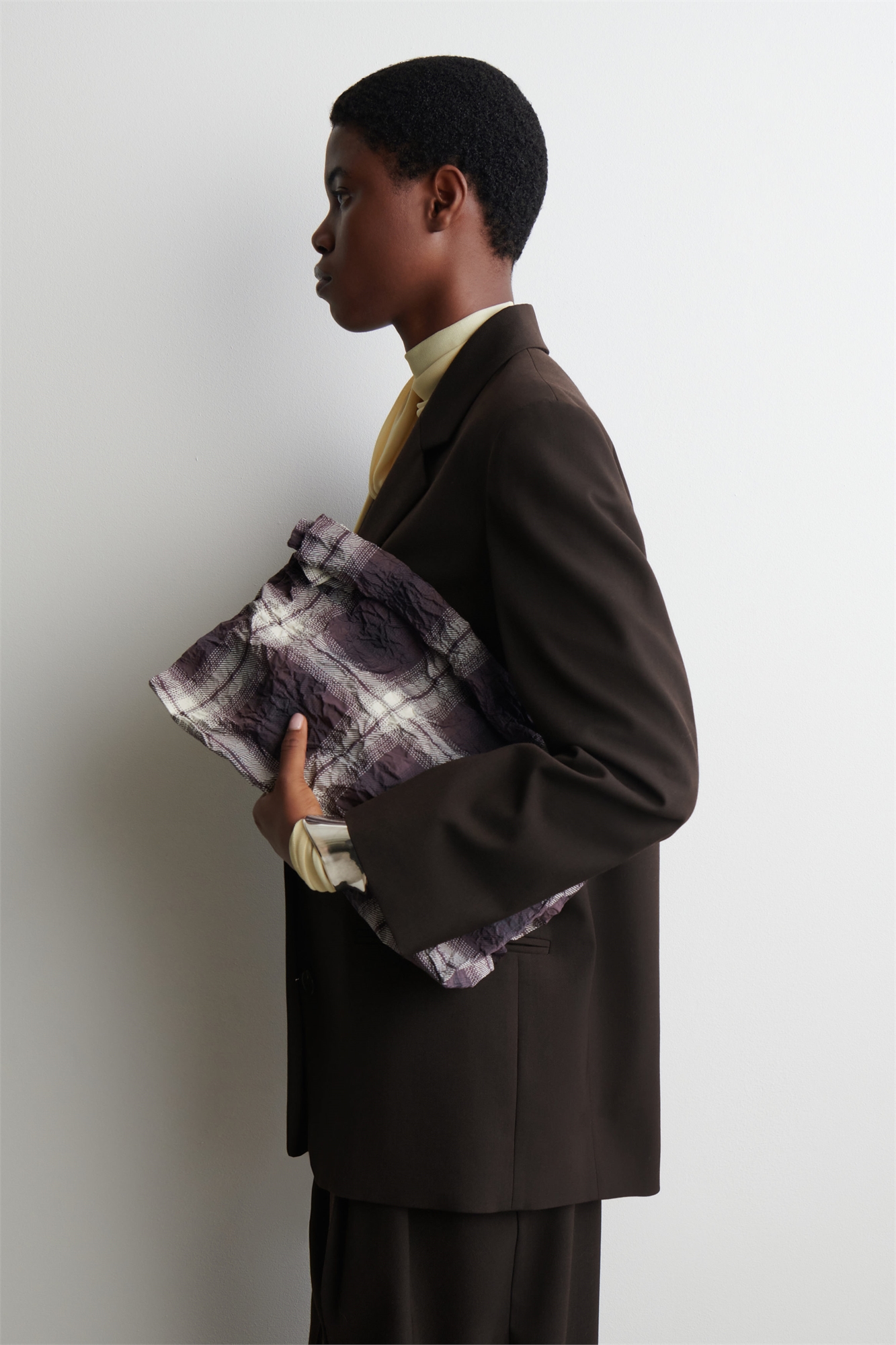 Этот современный клатч станет определяющим элементом сезона осень-зима 2025. Этот клатч преувеличенной формы, с закручивающимся силуэтом, изготовлен из тактильно приятной на ощупь мятой ткани. Характерный клетчатый узор был создан в ателье COS. Магнитная застежкаПереработанный полиэстер - это полиэстер, изготовленный из ПЭТ-бутылок или текстильных отходов, вышедших из употребления. ПЭТ-бутылки или текстильные отходы подвергаются механической переработке и перерабатываются в новую пряжу Оболочка: 100% переработанный полиэстер. Подкладка: 50% хлопка, 50% переработанного хлопка. Без учета отделки Высота: 35 см, Ширина: 40 см, Глубина: 13 см.