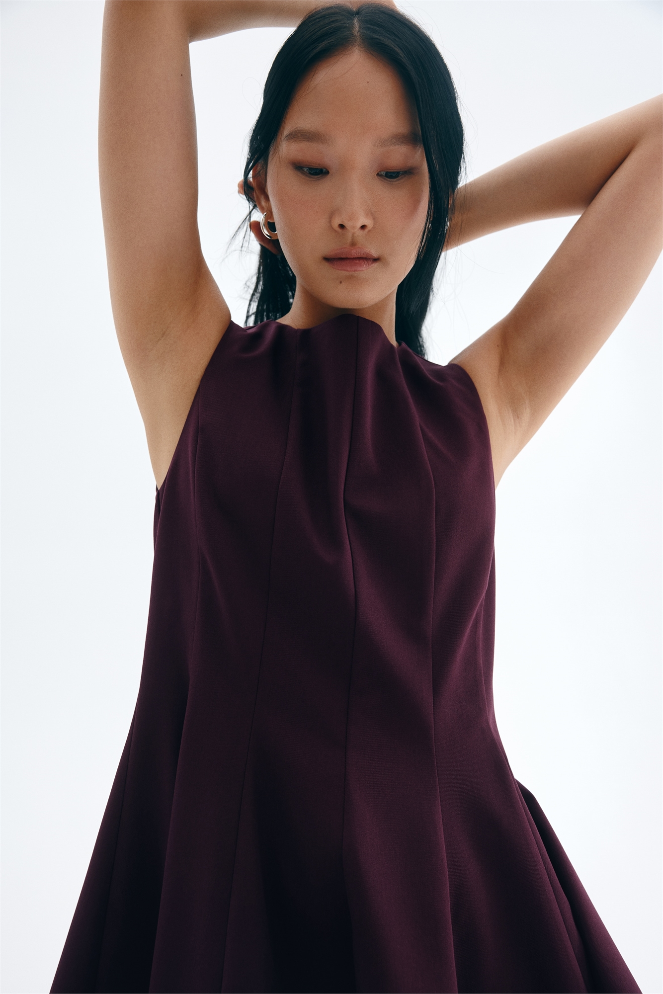 Короткое платье без рукавов из саржи с вырезом-лодочкой и потайной застежкой на молнию и крючок-глазок сзади. Формообразующие швы спереди и сзади и расклешенная юбка. Частично на подкладке.