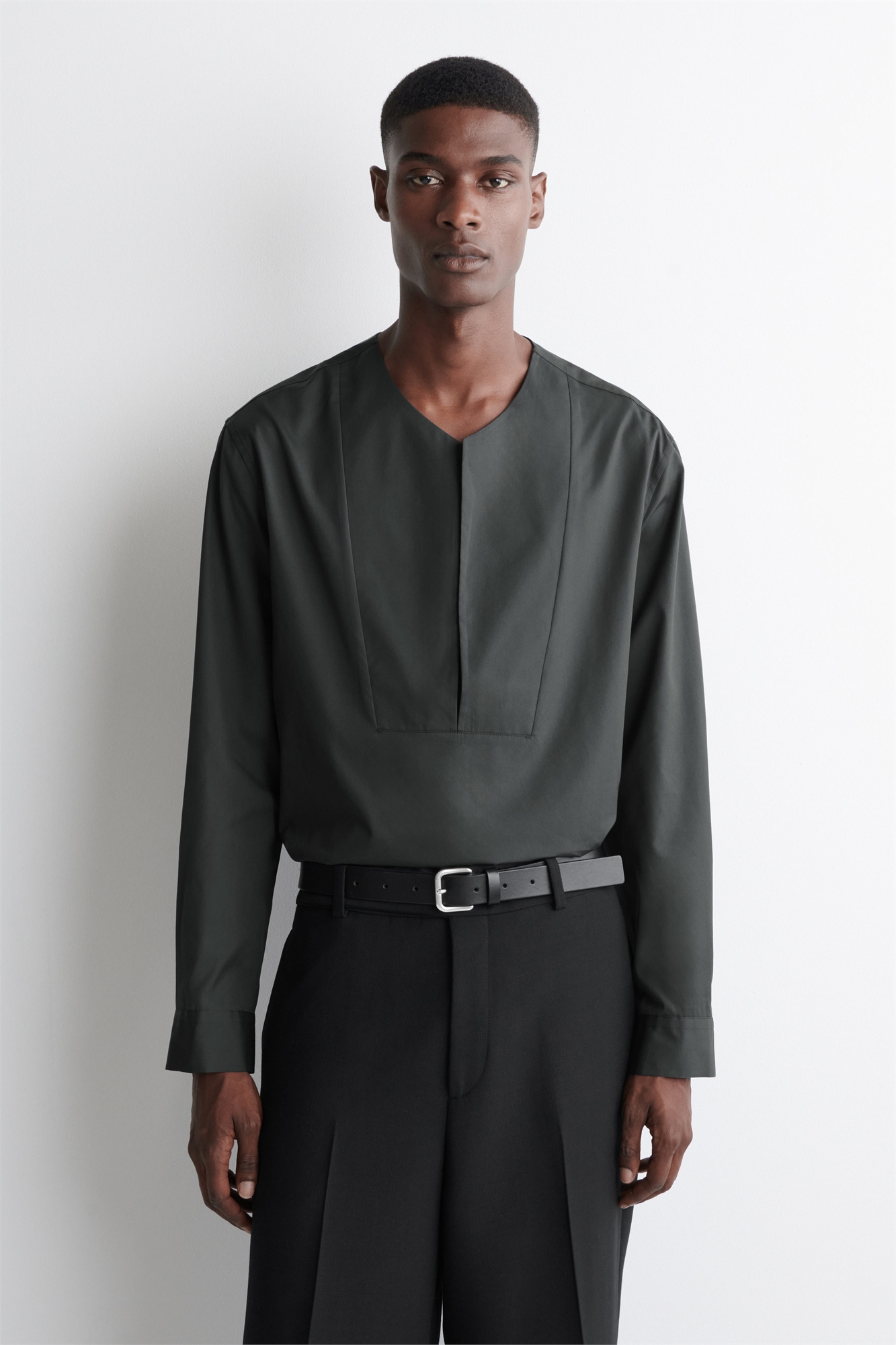 Рубашка без воротника из шелкового микса с V-образным вырезом