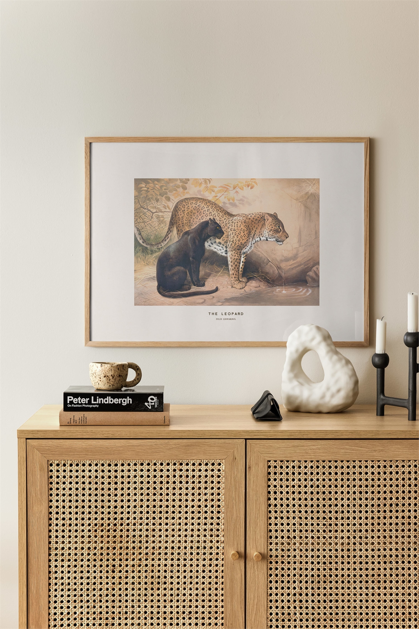 Пара леопардов изображена в традиционном натуралистическом стиле, подчеркивающем их окружение.