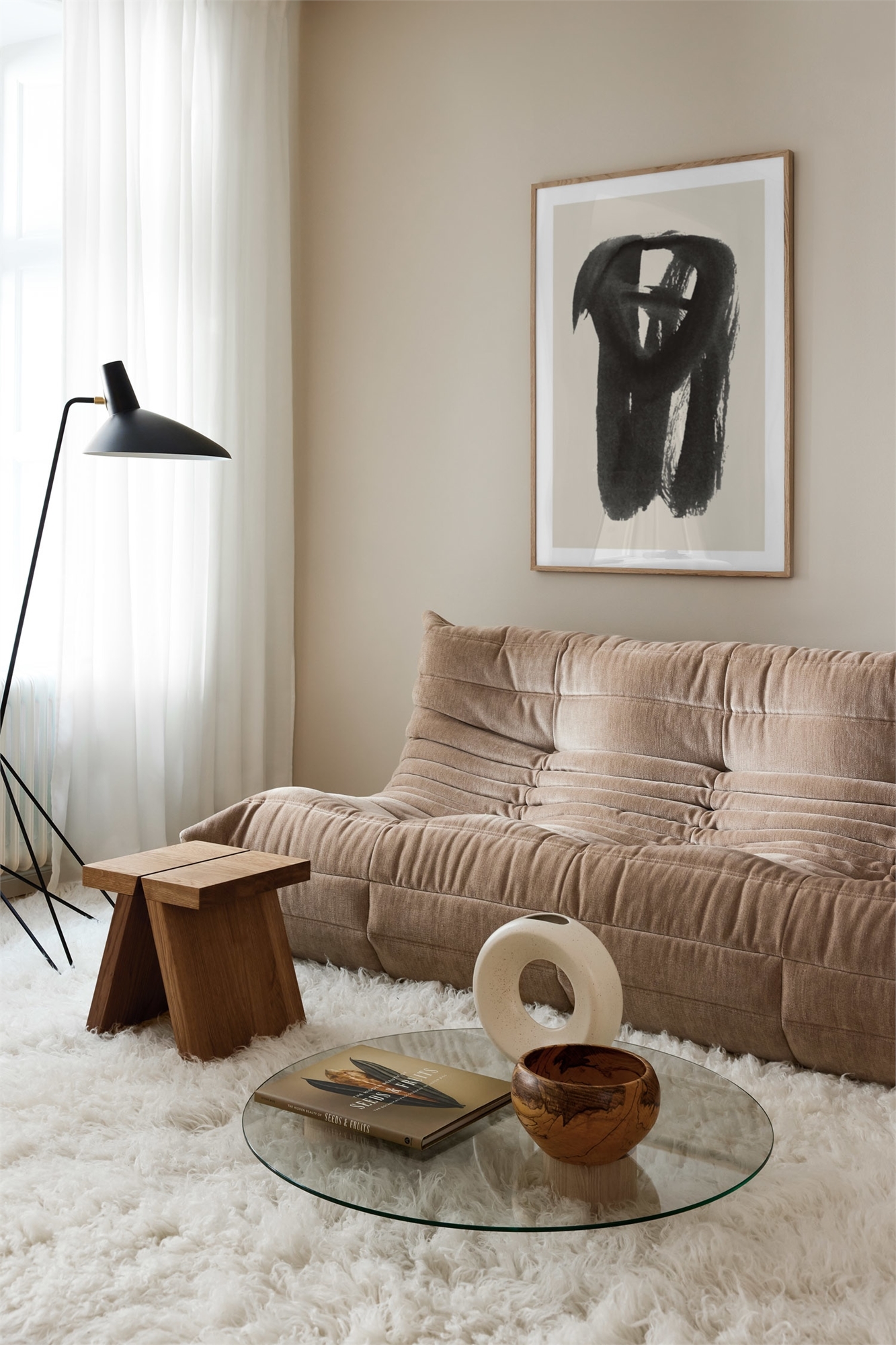 Абстрактная черная фигура, созданная мазками кисти и изогнутыми линиями, придает композиции ощущение динамичного движения. Мотив обрамлен встроенным паспарту.