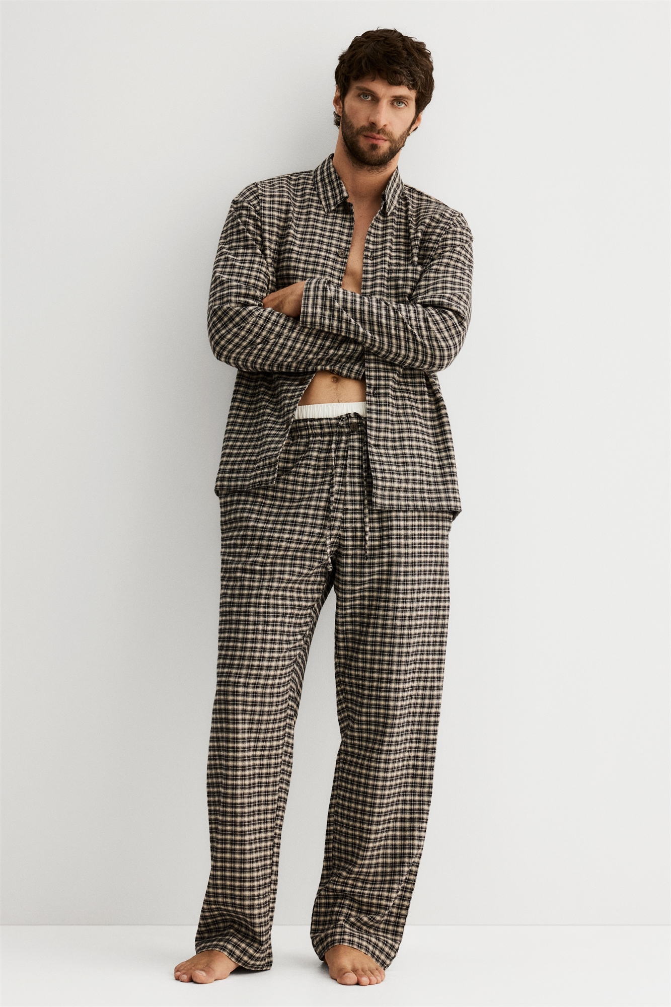 Пижама с рубашкой и нижней частью из мягкой хлопковой фланели. Рубашка с отложным воротником, французским передом, нагрудным карманом и прямым подолом. Нижние брюки с эластичным поясом, скрытым шнурком и декоративной пуговицей спереди, фальшивой ширинкой и незаметными боковыми карманами.