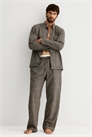 Пижама с рубашкой и нижней частью из мягкой хлопковой фланели. Рубашка с отложным воротником, французским передом, нагрудным карманом и прямым подолом. Нижние брюки с эластичным поясом, скрытым шнурком и декоративной пуговицей спереди, фальшивой ширинкой и незаметными боковыми карманами.