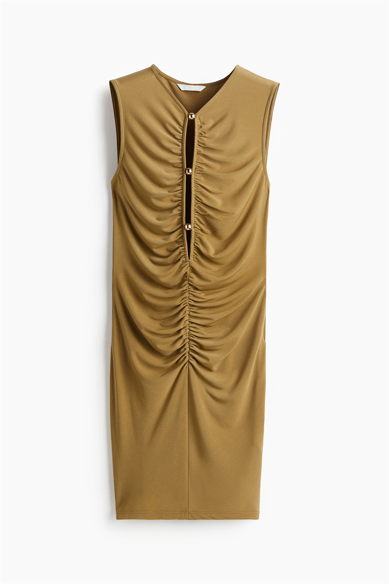 Короткое платье без рукавов из стрейчевого джерси с V-образным вырезом и глубокой проймой спереди, украшенной металлическими бусинами. Облегающий крой со складками спереди для создания привлекательного драпированного силуэта.