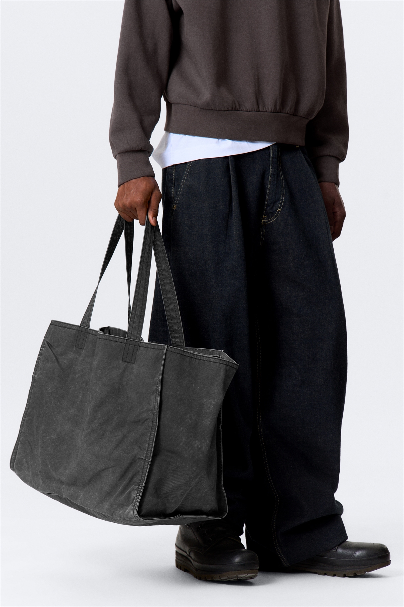 Большая сумка-тоут изготовлена из моющегося переработанного полиэстера. Сумка оснащена верхними ручками, боковыми кнопками для универсальной укладки и застежкой-ремешком. Размеры сумки составляют примерно 45 см в ширину, 35 см в высоту, 26 см в глубину, а длина ручки - 30 см.
