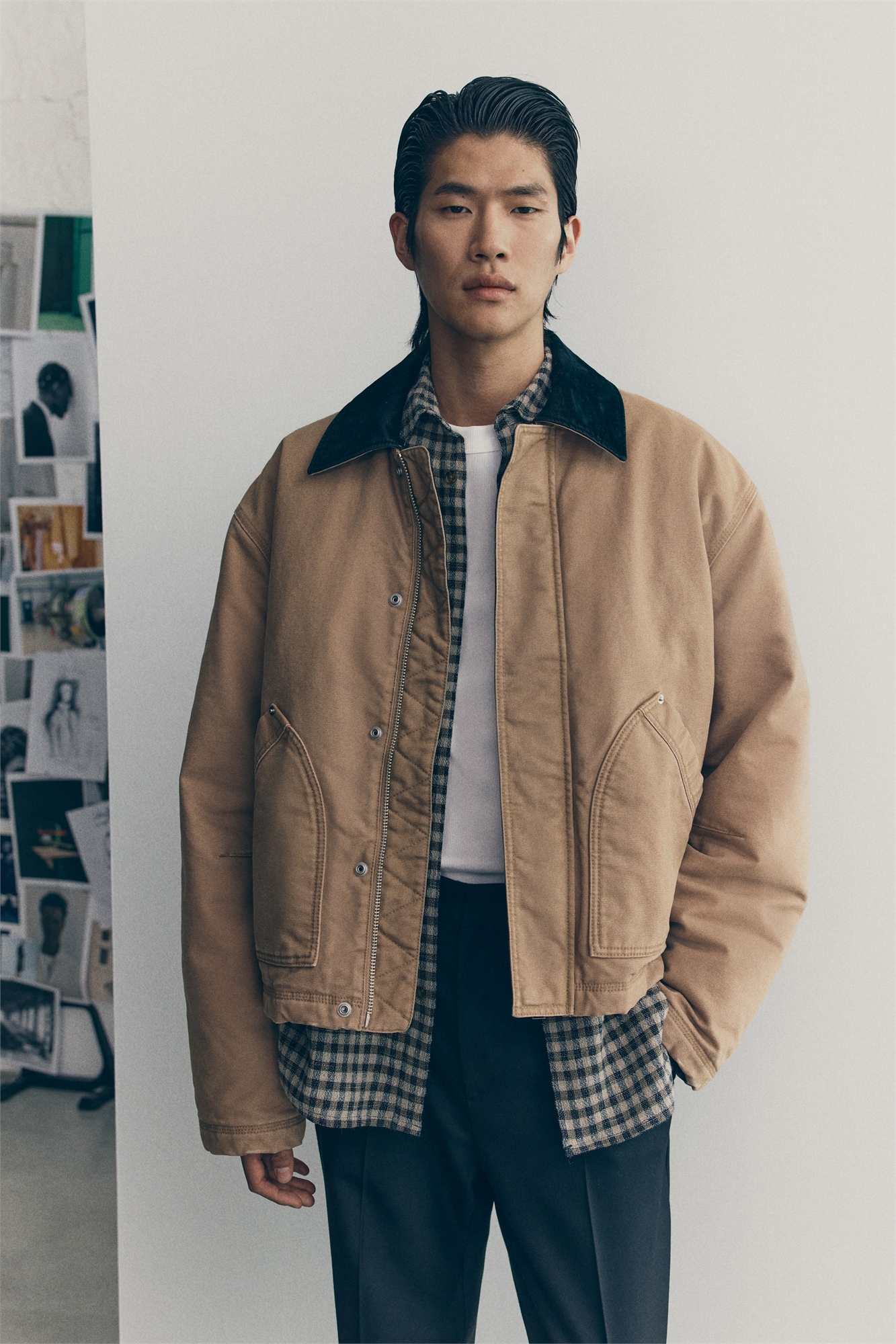Короткая рабочая куртка с легкой подкладкой изготовлена из хлопкового холста с контрастным воротником из хлопково-вискозной саржи. Модель имеет свободный крой, застежку-молнию спереди и ветрозащитную планку с потайными кнопками. Детали: спущенные плечи, длинные рукава, задний воротник, накладные передние карманы и шнурок со стопорами на подоле. Два внутренних кармана. Луковая стеганая подкладка.