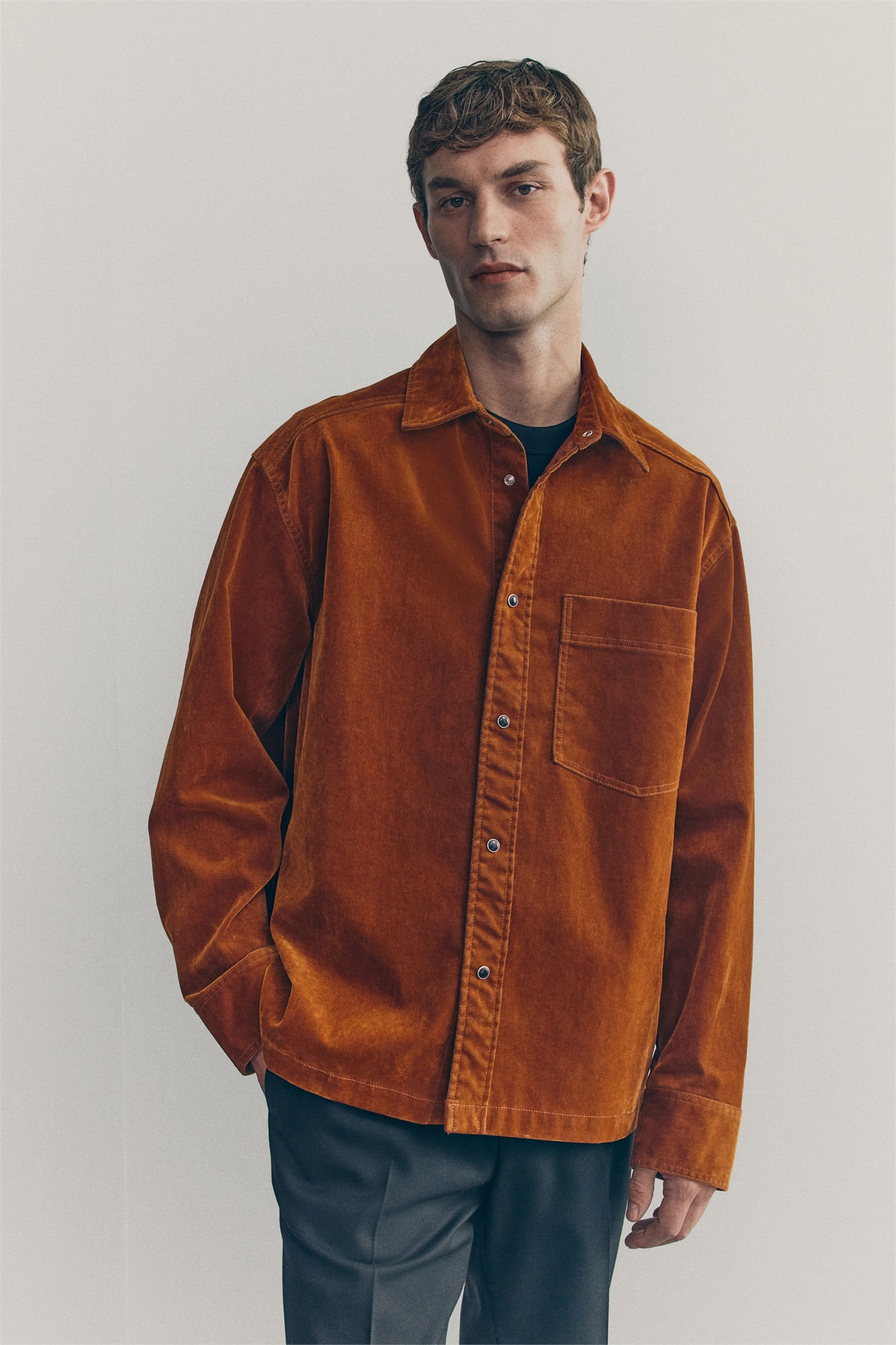 Куртка-рубашка сшита из матовой хлопково-вискозной саржи. Свободный крой, воротник, классическая передняя часть с кнопками, длинные рукава с прорезями для манжет и кнопками, нагрудный карман. Детали включают задний яр и прямой подол.