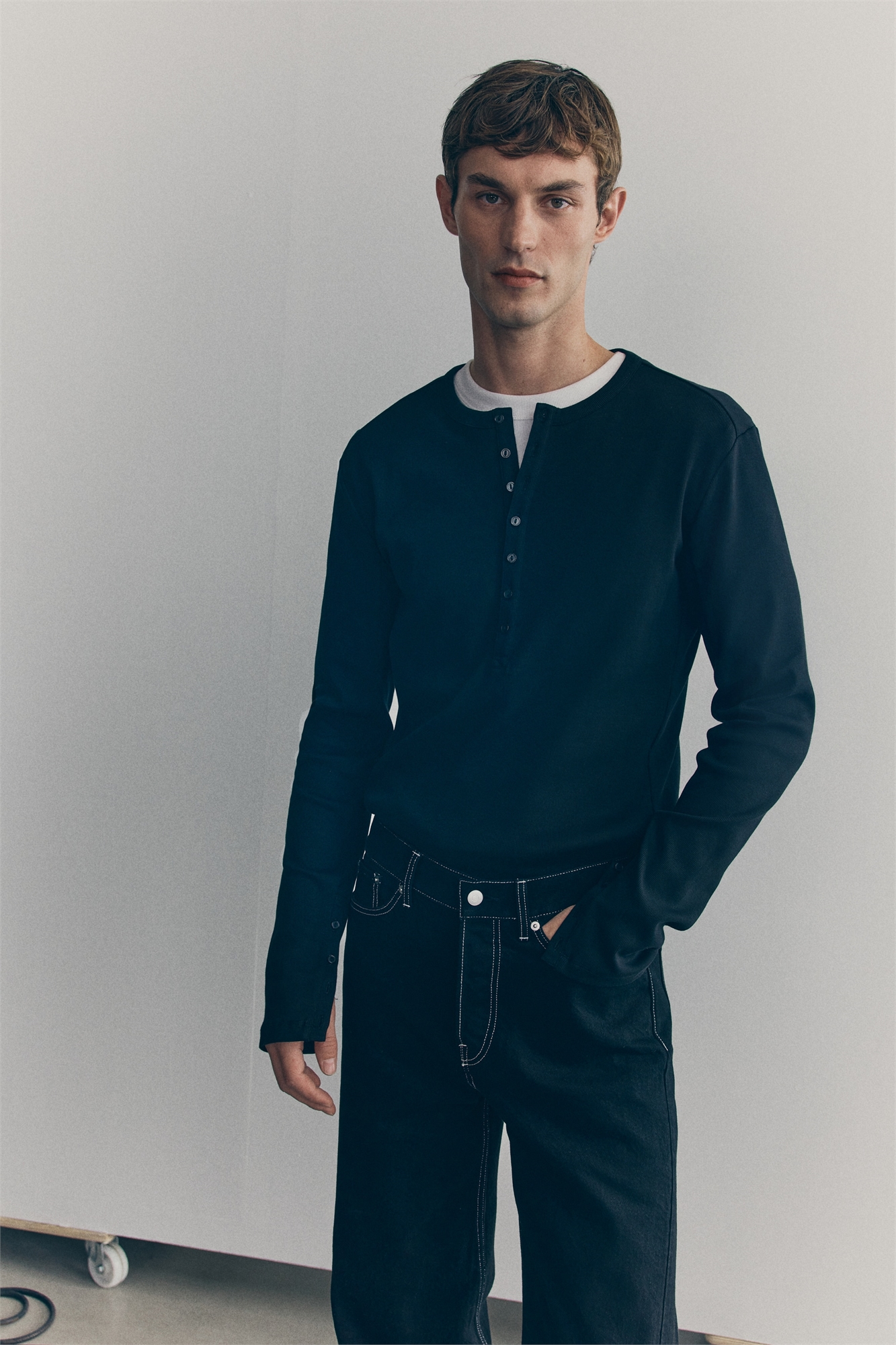 Топ Henley изготовлен из ребристого хлопкового джерси повышенной плотности. Модель имеет зауженный крой, круглый вырез с ребристой отделкой, застежку на пуговицах, длинные рукава с втачными манжетами и подвернутые боковые швы. Подол имеет прямой крой.