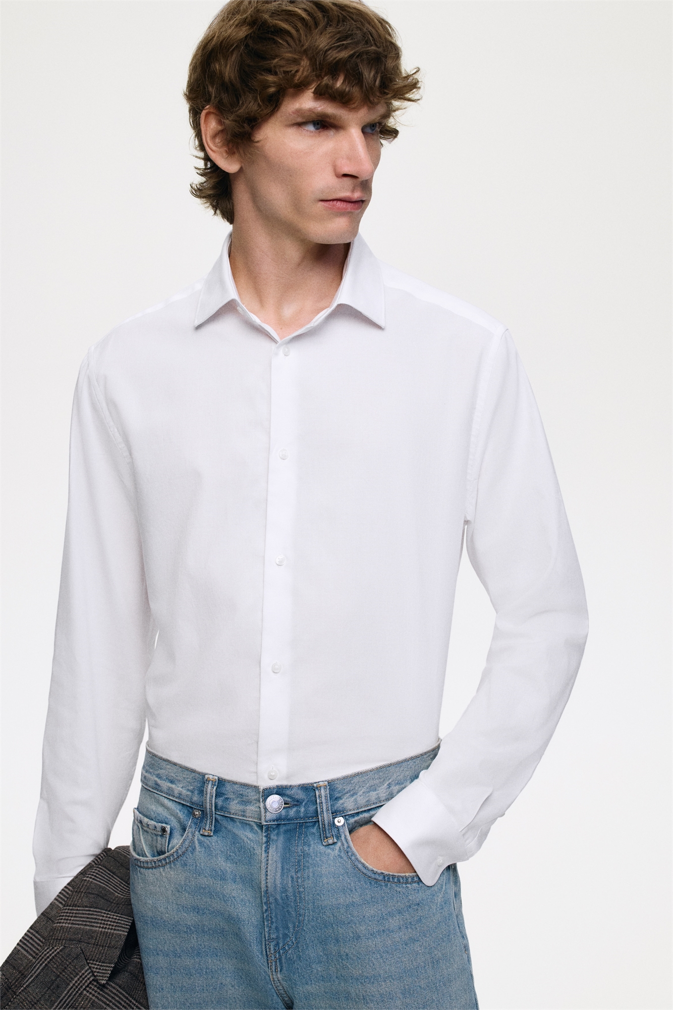Рубашка из мягкого хлопкового полотна с отложным воротником, французским передом и задним ярмом. Длинные рукава, регулируемые манжеты на пуговицах и рукавная петля с пуговицей. Аккуратный закругленный подол. Зауженный крой, облегающий контуры тела и создающий приталенный силуэт.