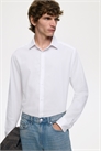 Рубашка из мягкого хлопкового полотна с отложным воротником, французским передом и задним ярмом. Длинные рукава, регулируемые манжеты на пуговицах и рукавная петля с пуговицей. Аккуратный закругленный подол. Зауженный крой, облегающий контуры тела и создающий приталенный силуэт.
