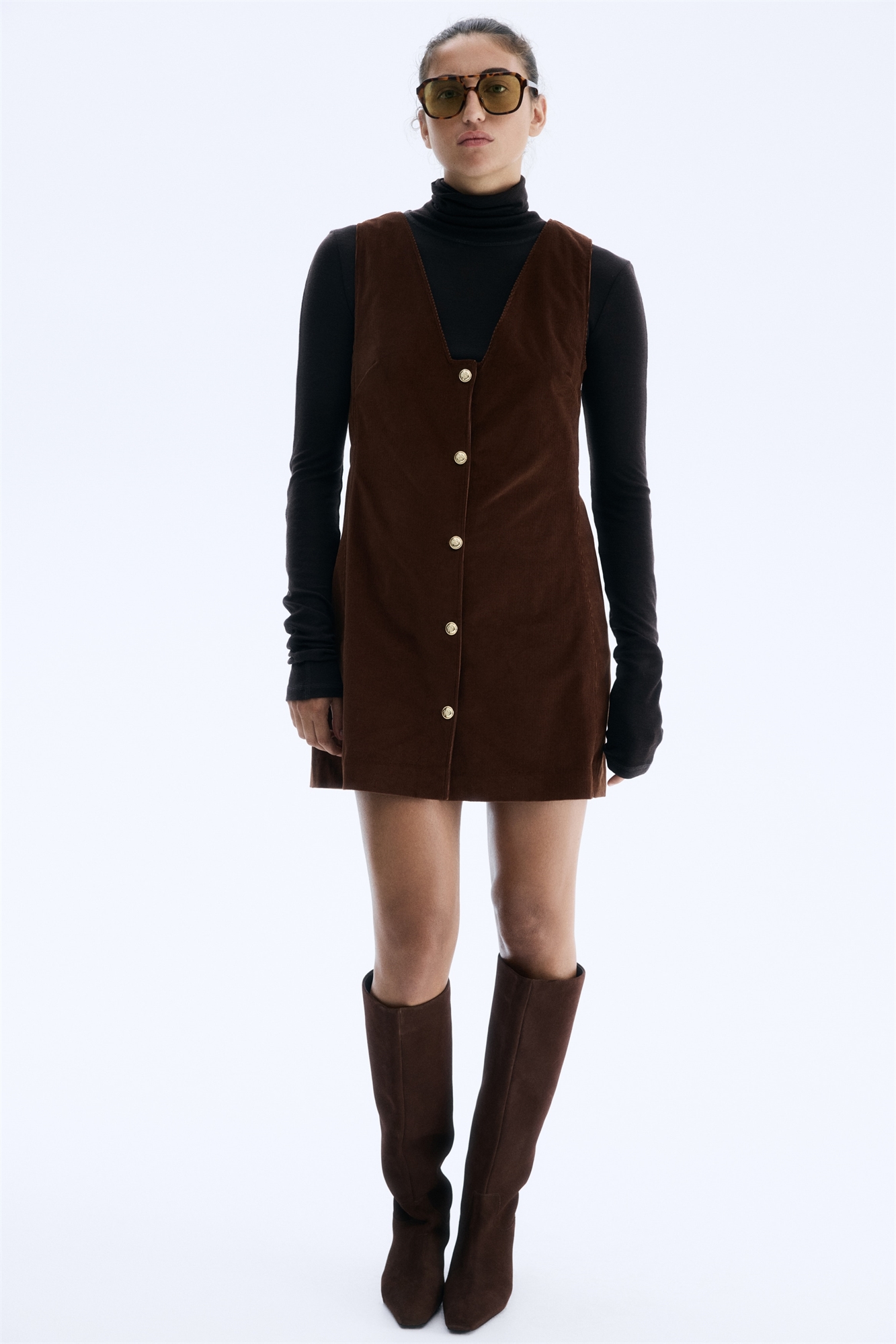 Короткое платье без рукавов из хлопкового вельвета с V-образным вырезом и металлическими пуговицами спереди. На подкладке.