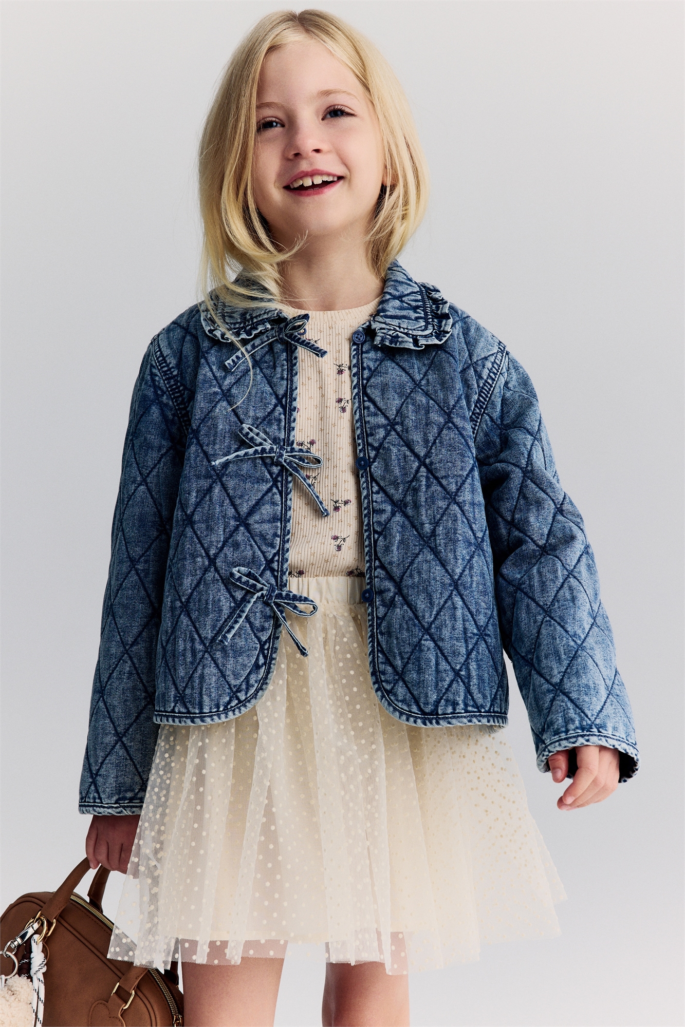 Куртка свободного покроя из стеганого хлопкового денима с воротником с отделкой из оборок. Скрытые застежки на пуговицах и петлях и декоративные банты спереди. Закругленный подол. На подкладке.