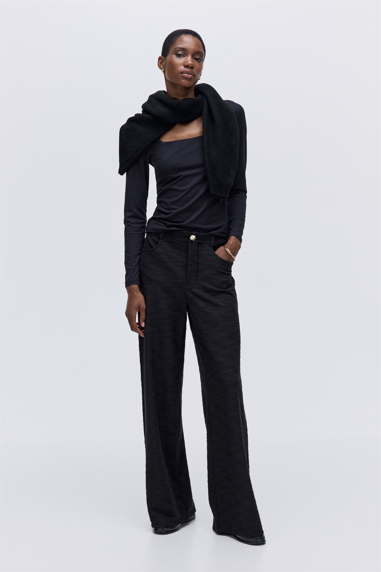 Брюки из ткани букле с эластичным поясом, фальшивой ширинкой, передними карманами и накладными задними карманами. Прямые ноги.