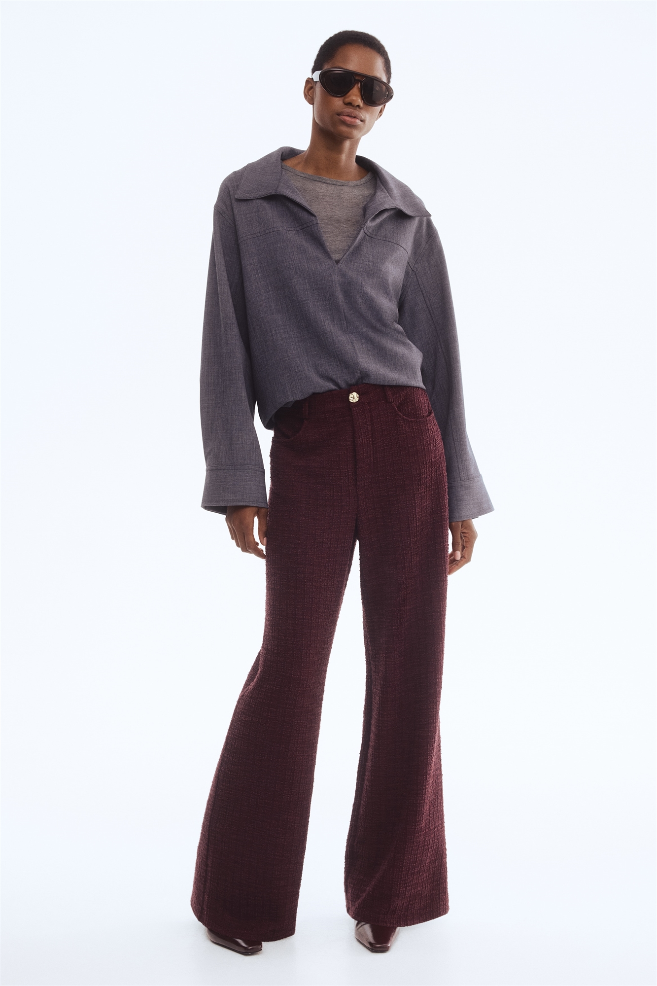 Брюки из ткани букле с эластичным поясом, фальшивой ширинкой, передними карманами и накладными задними карманами. Прямые ноги.
