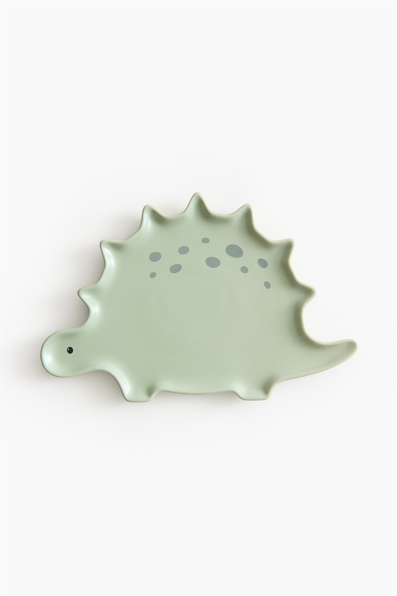 Детская тарелка из керамогранита в форме голодного стегозавра с шипами и коротким длинным хвостом.