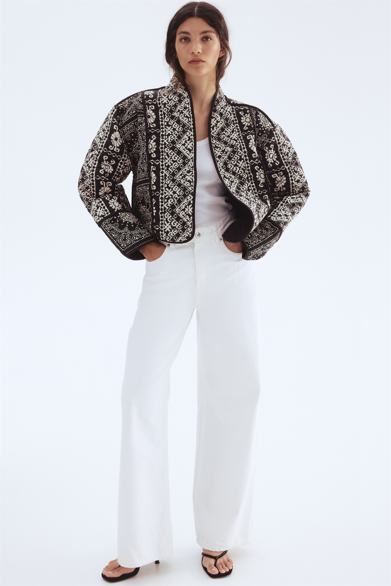 Куртка с легкой подкладкой из стеганого хлопкового полотна с узкими переплетами по всей длине. Высокий отложной воротник и открытая передняя часть. На подкладке.