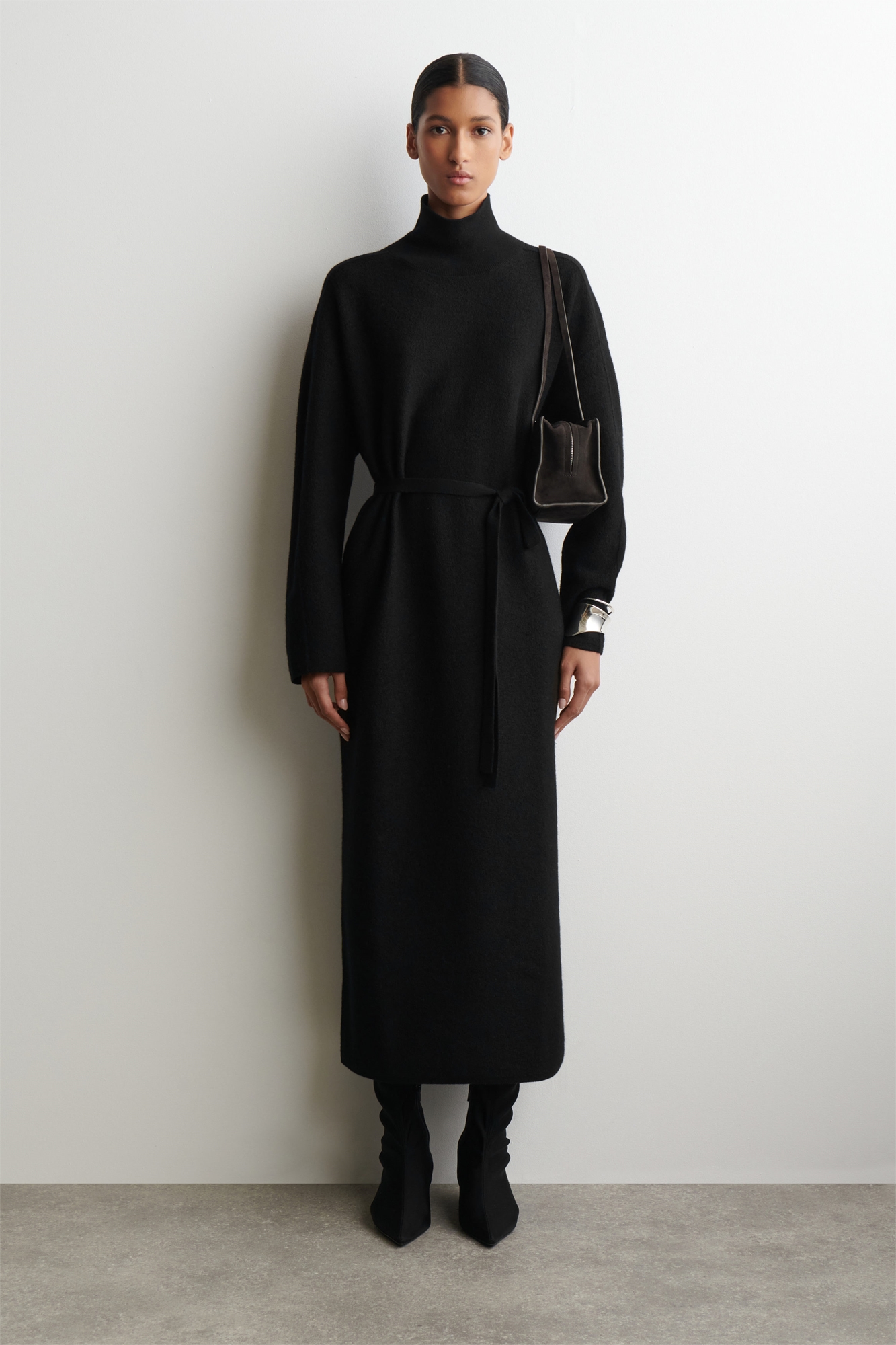 Трикотаж от COS отличается изысканными силуэтами и роскошной, не скользящей пряжей. Это черное платье с высоким воротником изготовлено из высококачественной вареной мериносовой шерсти. Оно имеет округлую форму, пояс на талии и накладной шов на плечах. Регулярный кройЭто изделие содержит волокна шерсти Responsible Wool Standard TE-00047206 (RWS) с ферм, сертифицированных в соответствии с требованиями к благополучию животных и сельскому хозяйству Внешний материал: 100% мериносовая шерсть. Детали исключены/Машинная стирка Длина по спинке в размере S = 124 см/Модель носит размер S