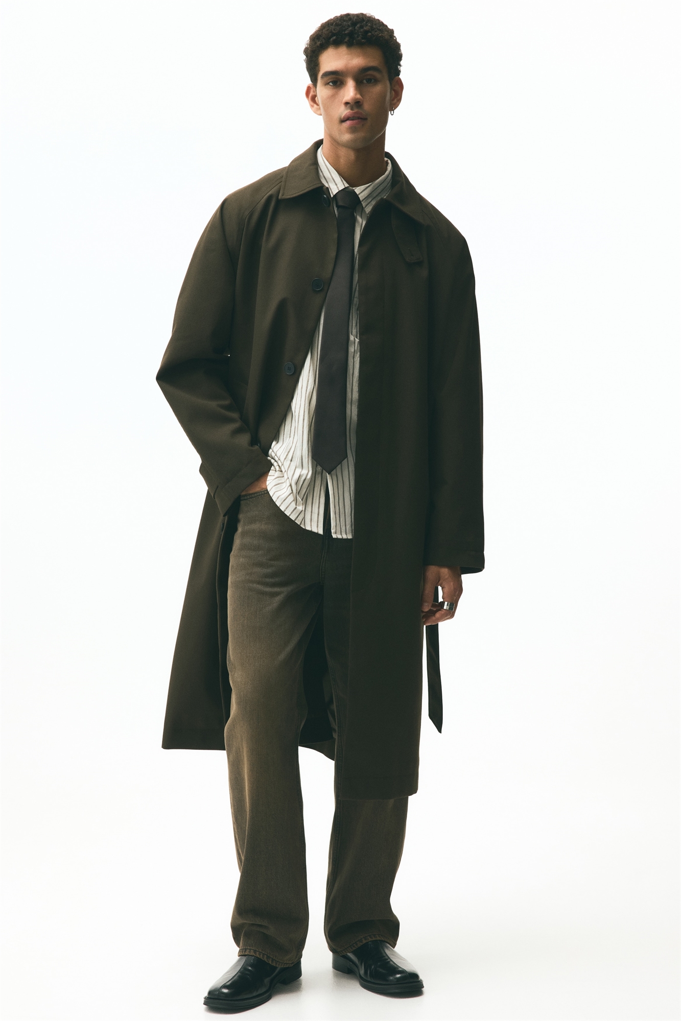 Пальто в стиле мак из мягкой саржи с воротником, хлястиком и потайными пуговицами спереди. Съемный пояс-завязка на талии, втачные передние карманы и длинные рукава реглан с манжетами на пуговицах. Одиночная вентиляция на спине. Свободный крой для пышного, но не чрезмерно большого силуэта. На подкладке.