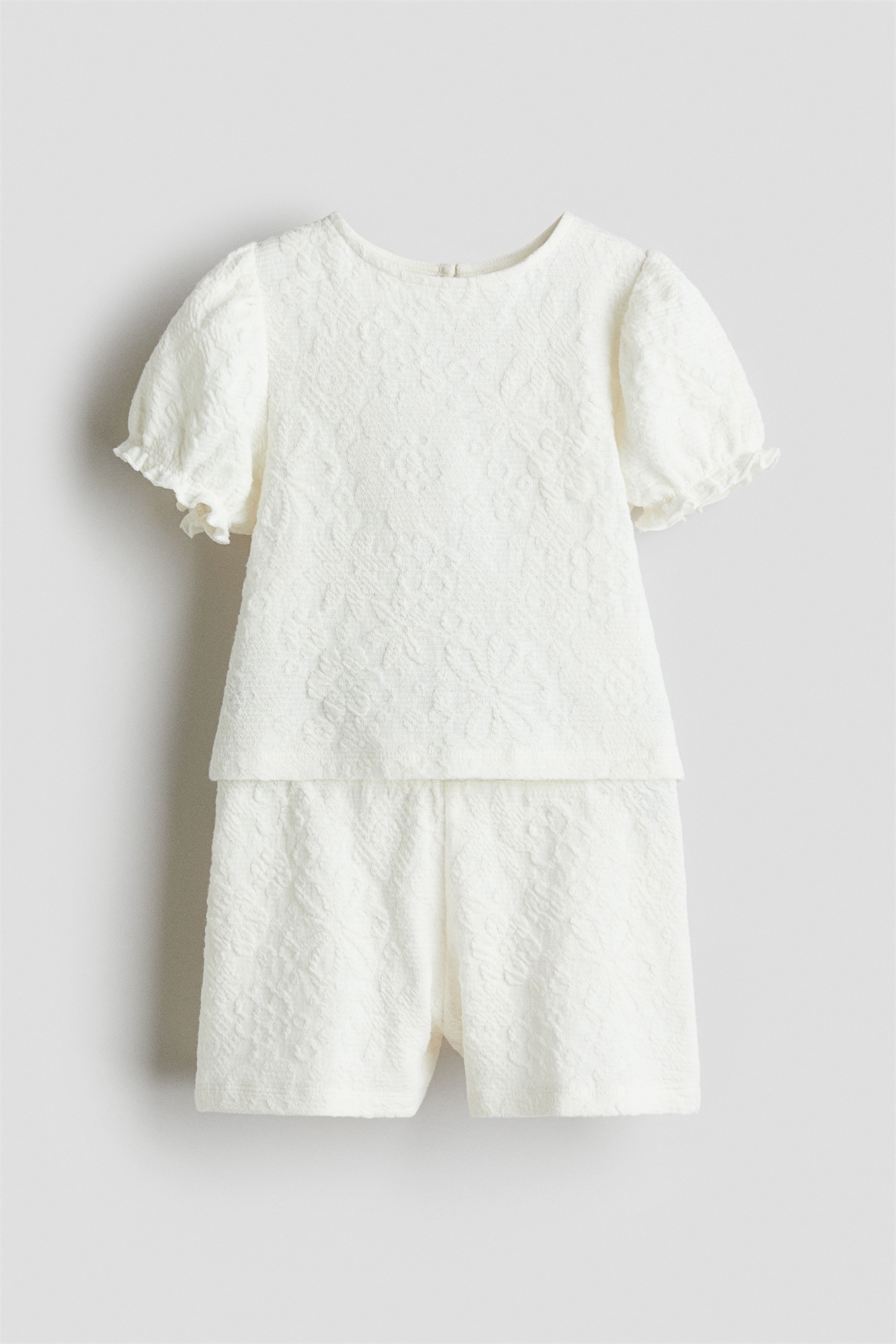 Комплект из топа и шорт из мягкого жаккардового трикотажа, выполненного из смеси хлопка. Топ с круглым вырезом, отверстием для ключа с пуговицей сзади и короткими пышными рукавами с эластичными манжетами, отделанными оборками. Шорты с эластичной талией.