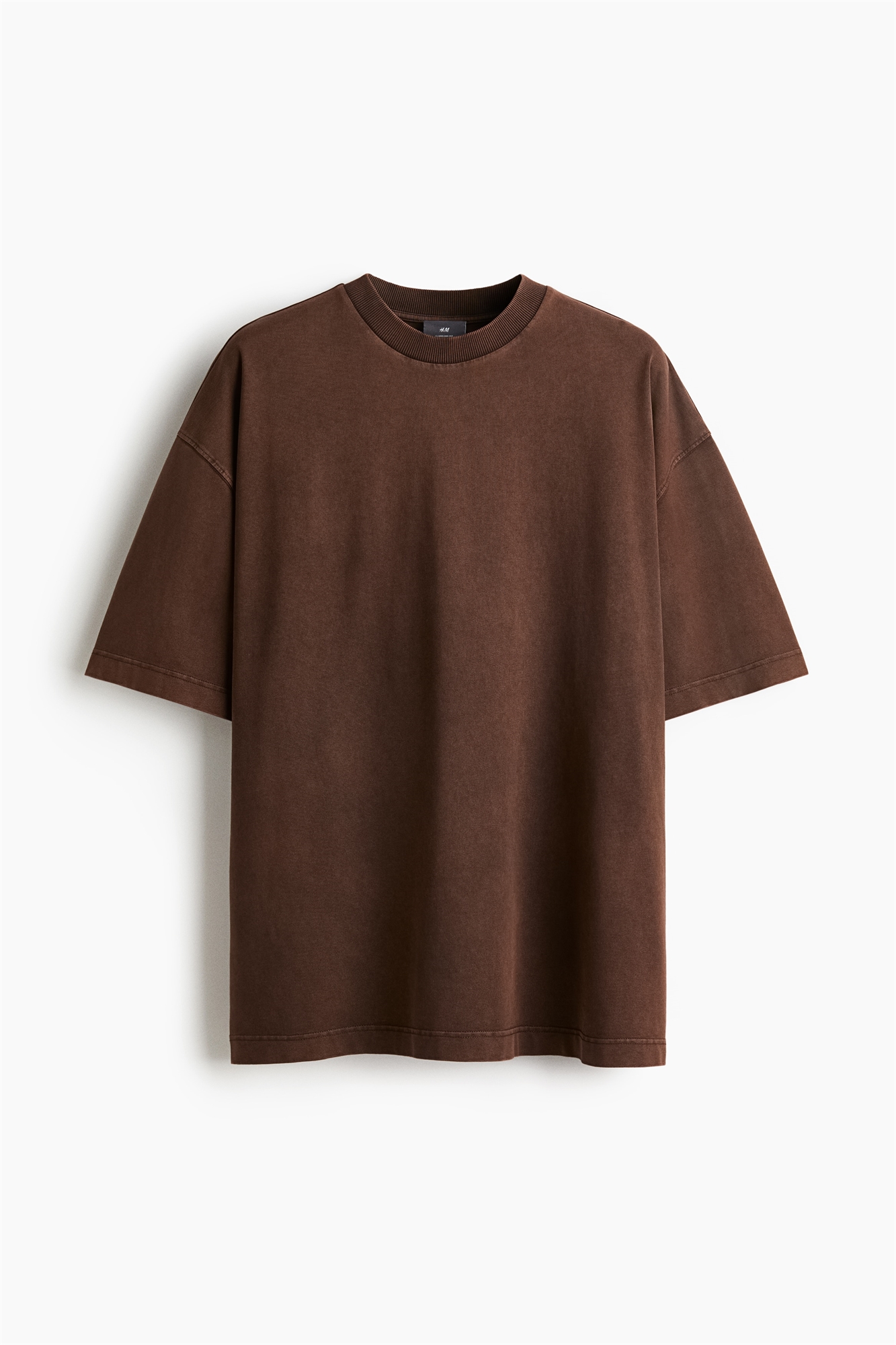 Футболка из плотного хлопкового джерси с круглым вырезом в рубчик, спущенными плечами и прямым покроем. Модель с завышенной посадкой для придания ей свободного силуэта.