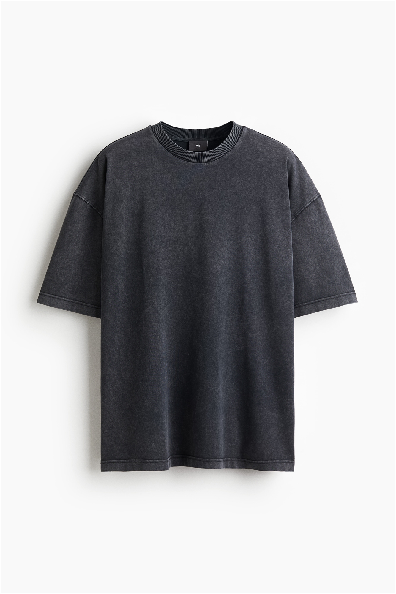 Футболка из плотного хлопкового джерси с круглым вырезом в рубчик, спущенными плечами и прямым покроем. Модель с завышенной посадкой для придания ей свободного силуэта.