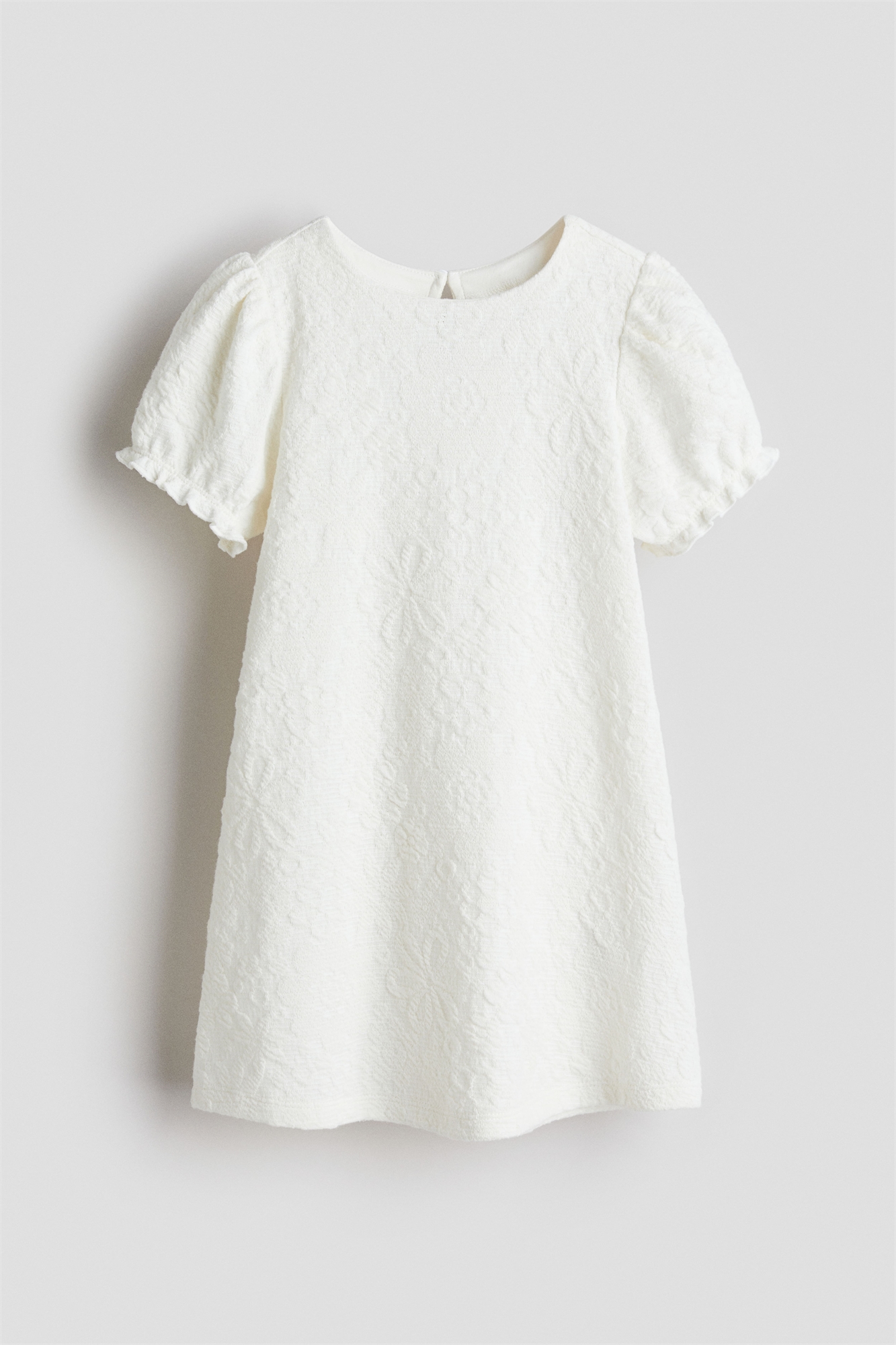 Платье А-линии из мягкого жаккардового джерси, изготовленного из смеси хлопка. Круглый вырез, отверстие для ключа с пуговицей сзади и короткие пышные рукава с эластичными манжетами с оборками.