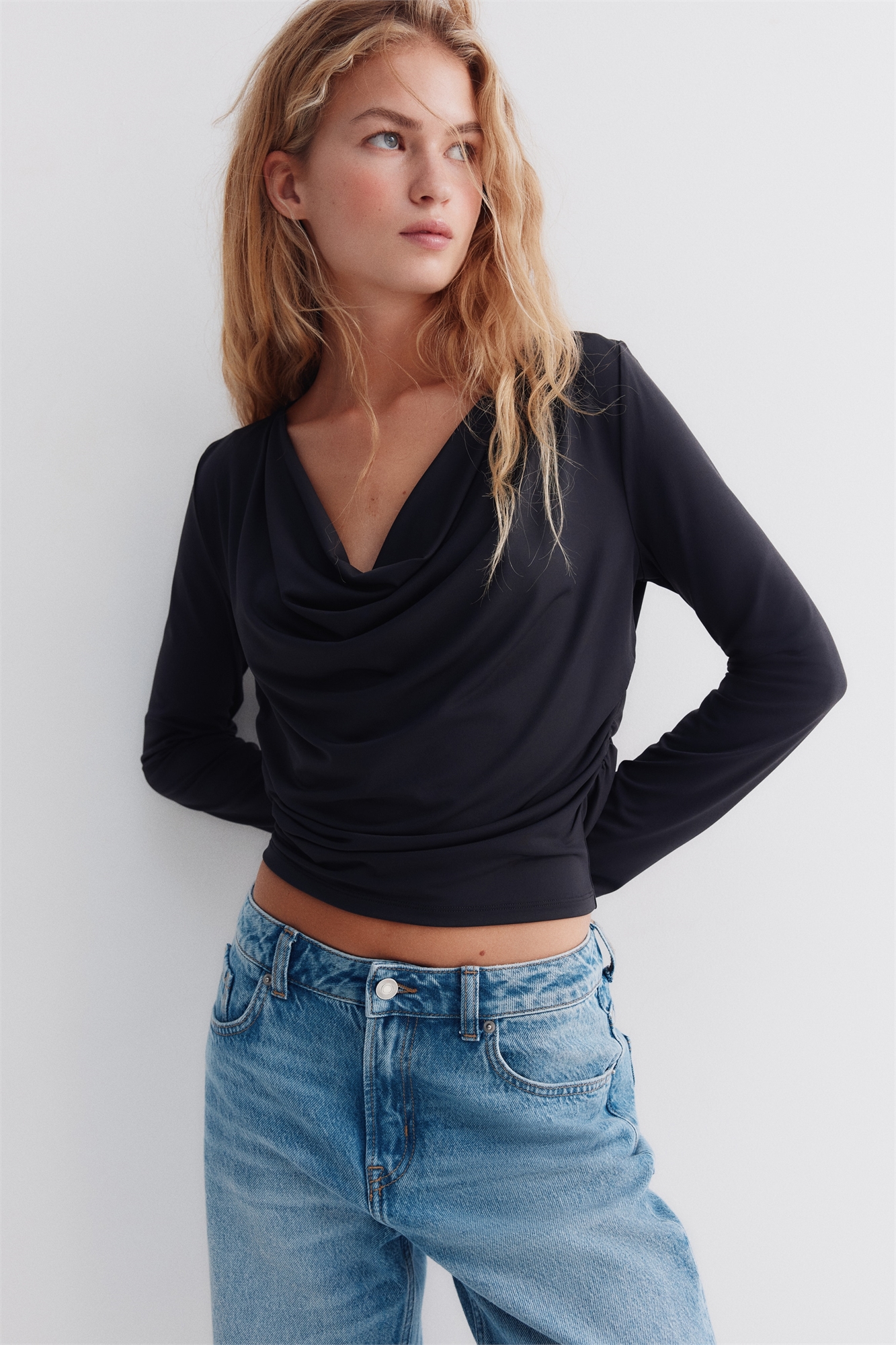 Облегающий топ с длинными рукавами из джерси с легким блеском. Глубокий вырез-лодочка и сборки по бокам, подчеркивающие эффект драпировки.