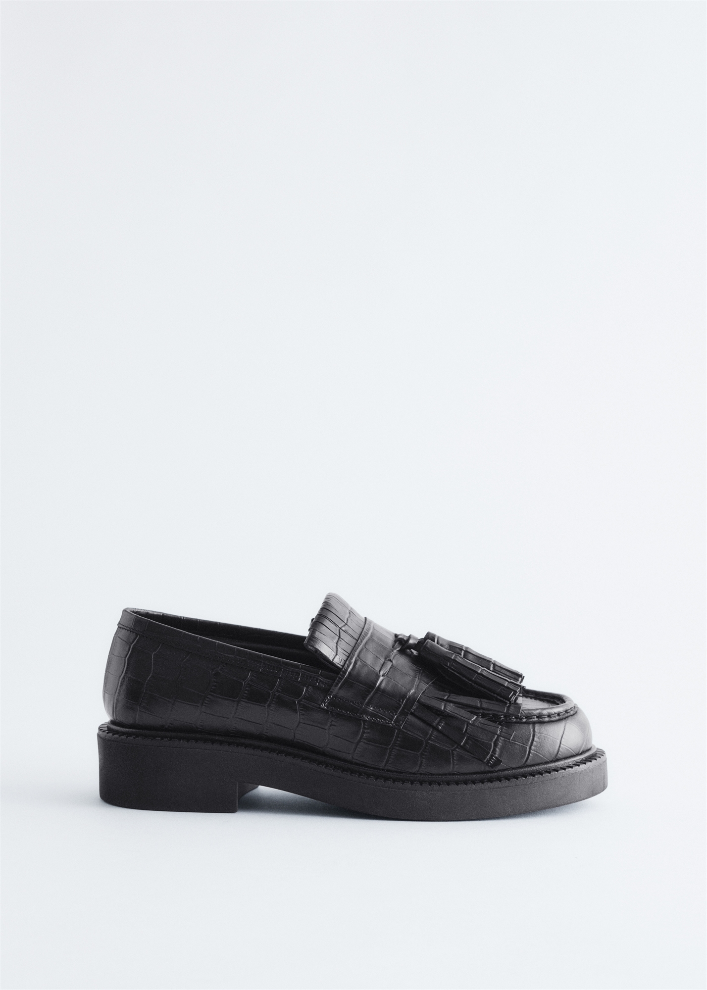 Лоферы изготовлены из 100% коровьей кожи. Модель имеет закругленный носок и высокий каблук, поддерживаемый резиновой подошвой для дополнительного комфорта и сцепления. Верхняя часть украшена кожаной нашивкой с бахромой.