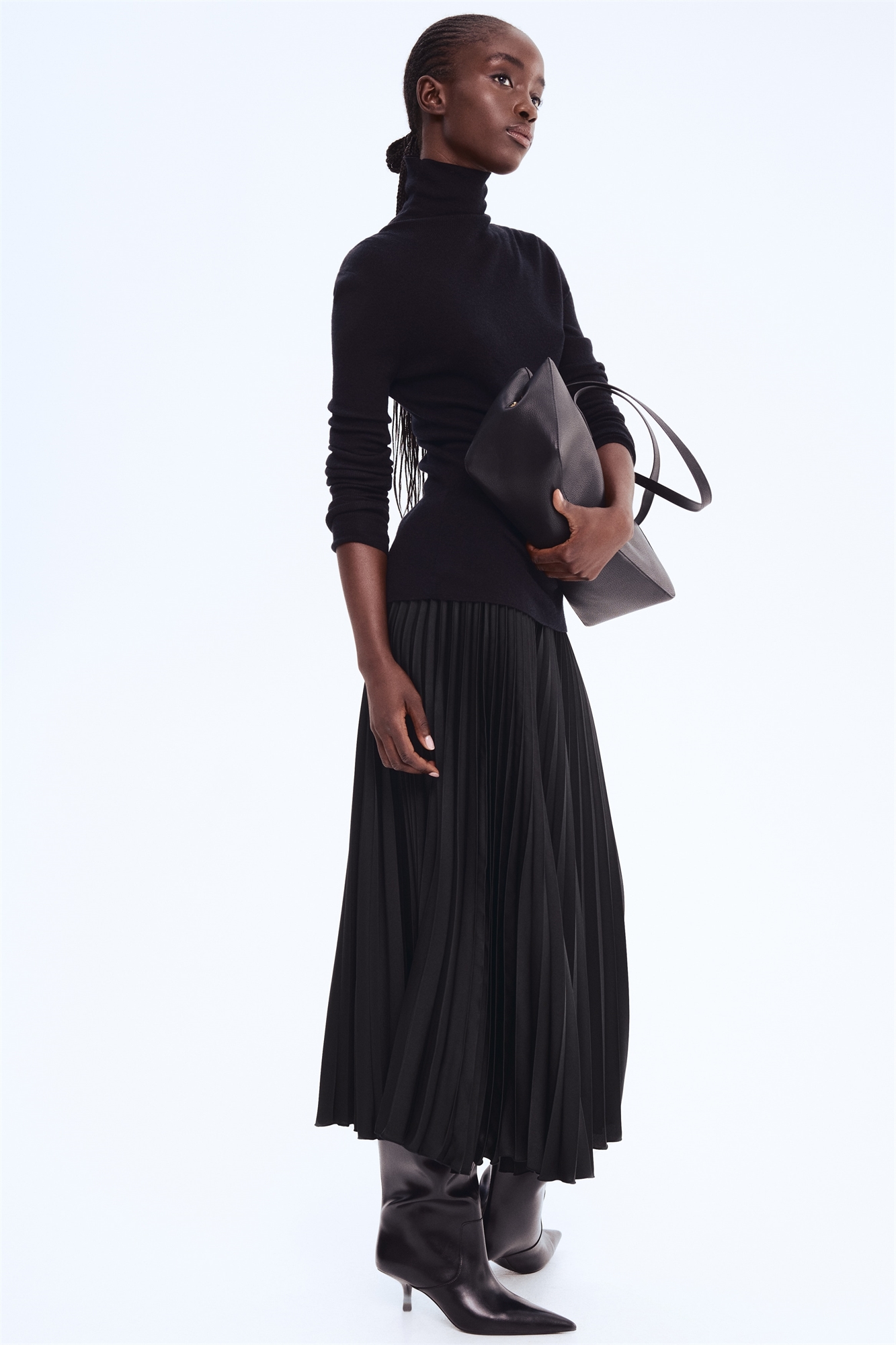 Плиссированная юбка длиной до колен из тканого материала с легким блеском. Высокая талия с узкой эластичной резинкой. Без подкладки.