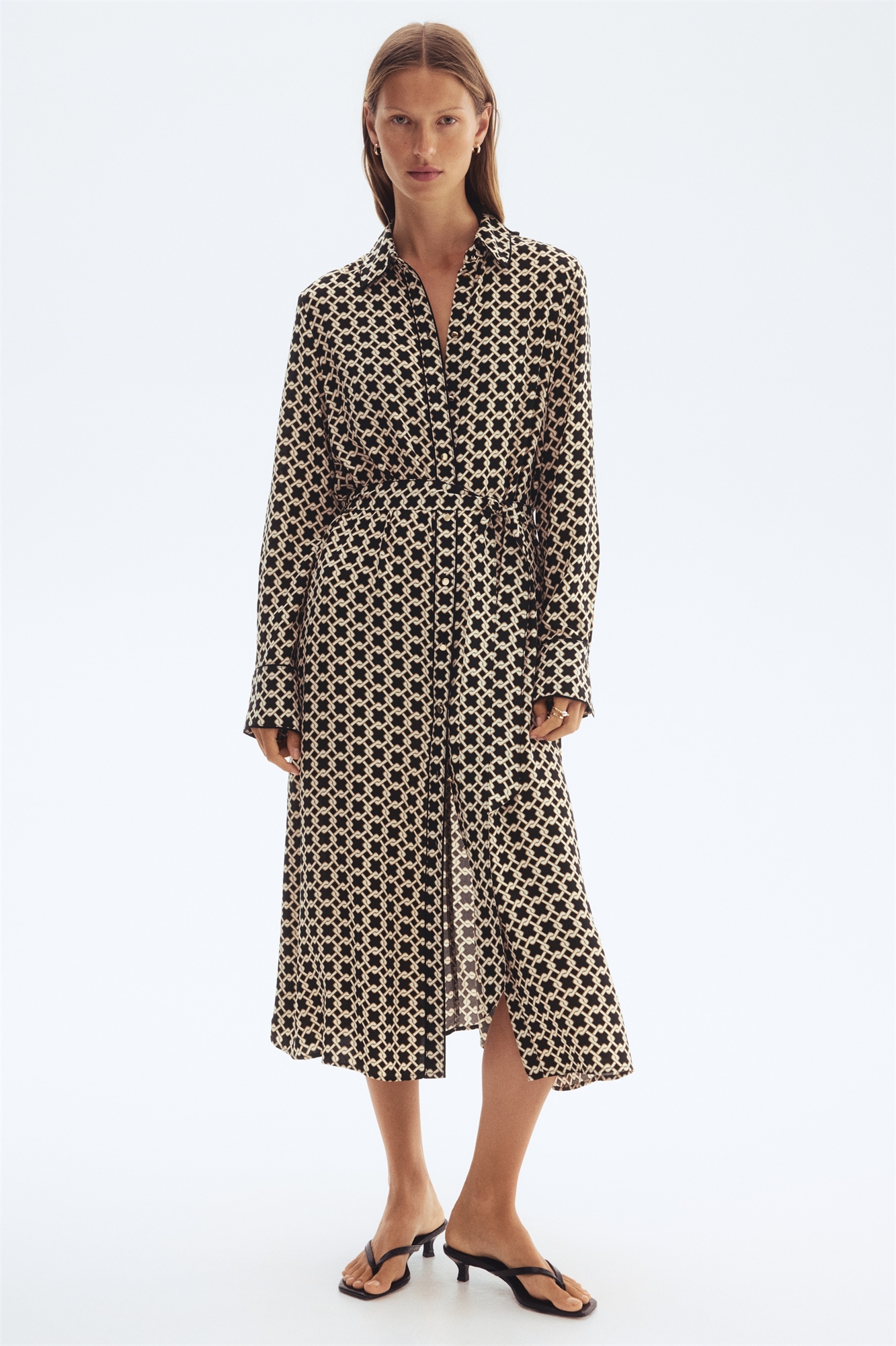 Платье-рубашка длиной до колен из вискозного полотна с тонкой отделкой. Воротник, металлические пуговицы спереди и широкий съемный пояс на талии. Слегка спущенные плечи и длинные рукава с разрезом и пуговицей на манжетах. Без отделки.