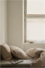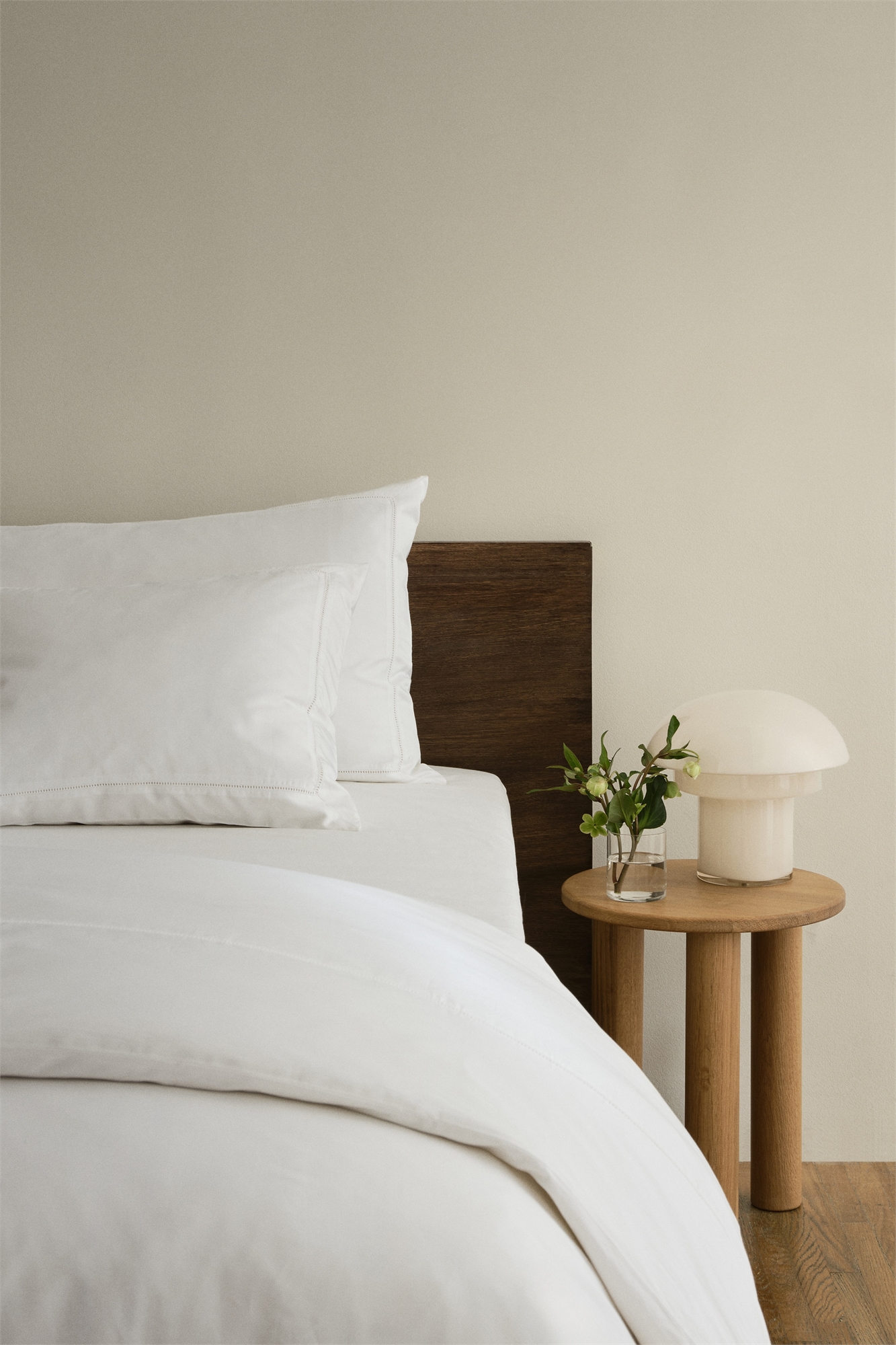 Односпальный пододеяльник из сатина из египетского хлопка с тонкой нитью и плотным плетением, с количеством нитей 350. Отделка кружевом "лесенка" тон в тон. Пододеяльник застегивается внизу на потайные пуговицы. Одна наволочка с отверстием для конверта.