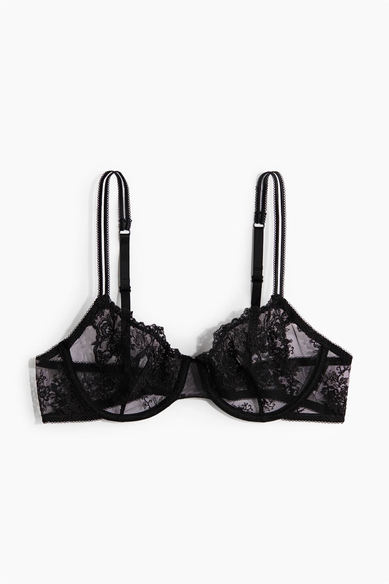 Бюстгальтер из вышитой сетки с регулируемыми бретелями и чашечками с заниженной талией, которые придают бюсту естественную форму и обеспечивают легкую поддержку. Застежка на крючки и глазки сзади.