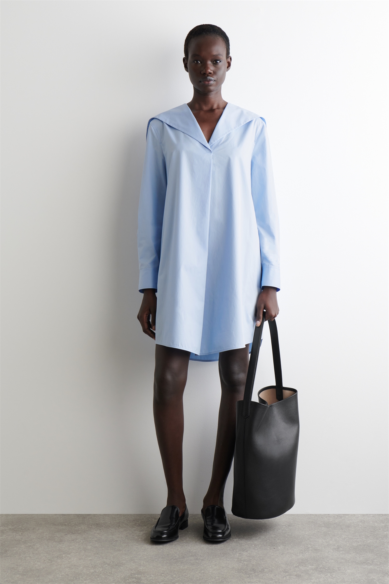 Это мини-платье, осовременивающее классические силуэты 60-х годов, имеет матросский воротник, расходящийся по плечам. Оно сшито из хрустящего хлопка-поплина в вымытом черном цвете и имеет манжеты на пуговицах, незаметные боковые карманы и закругленный подол. Подойдите к нему с балетками. Regular fit Материал: 100% хлопок. Без учета отделки / Машинная стирка Длина по спинке для размера EU 36 составляет 88,6 см / Модель носит размер EU 36