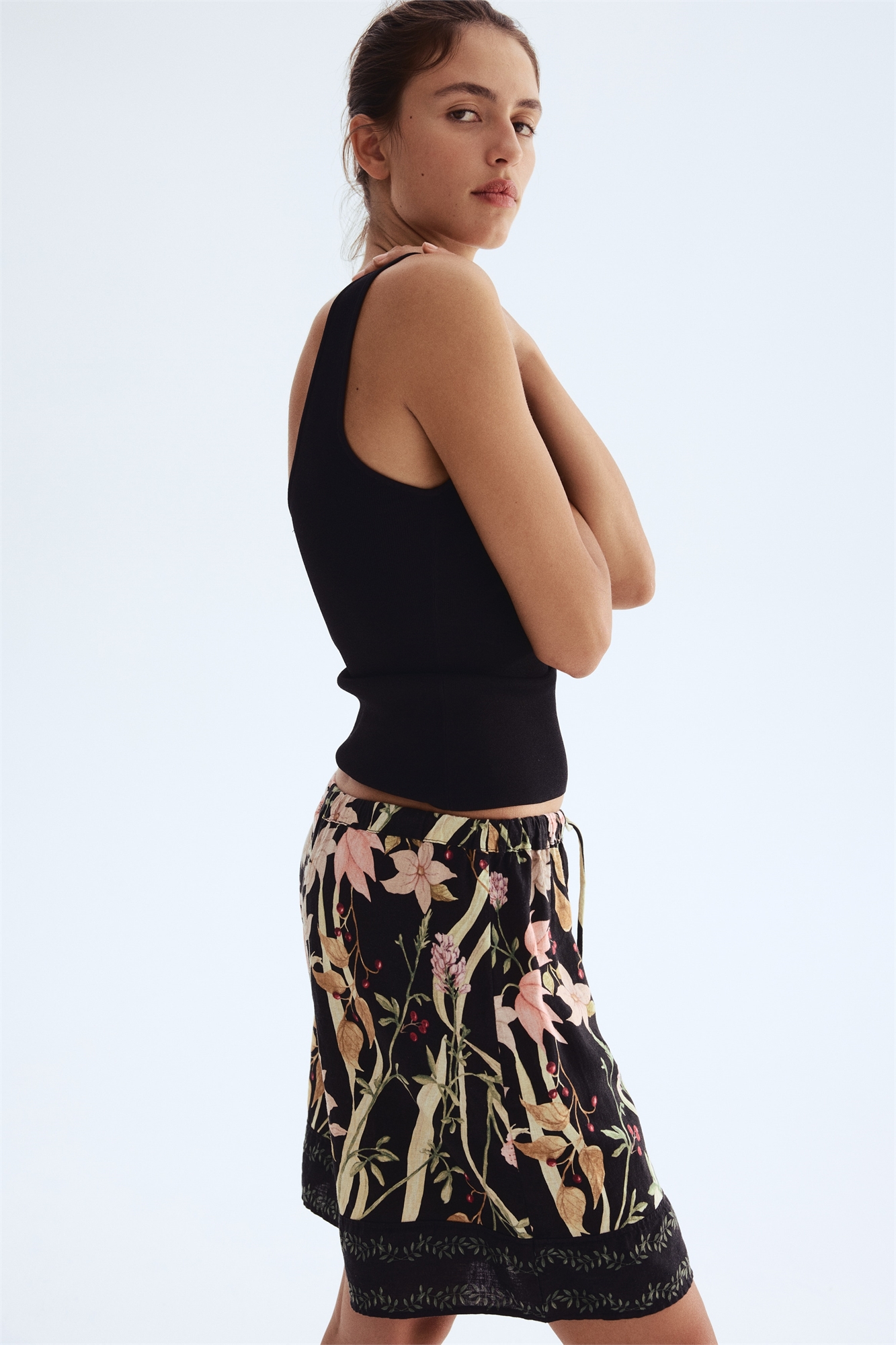 Шорты свободного покроя из воздушного льняного и вискозного полотна с высокой талией, эластичной отделкой и узким шнурком.