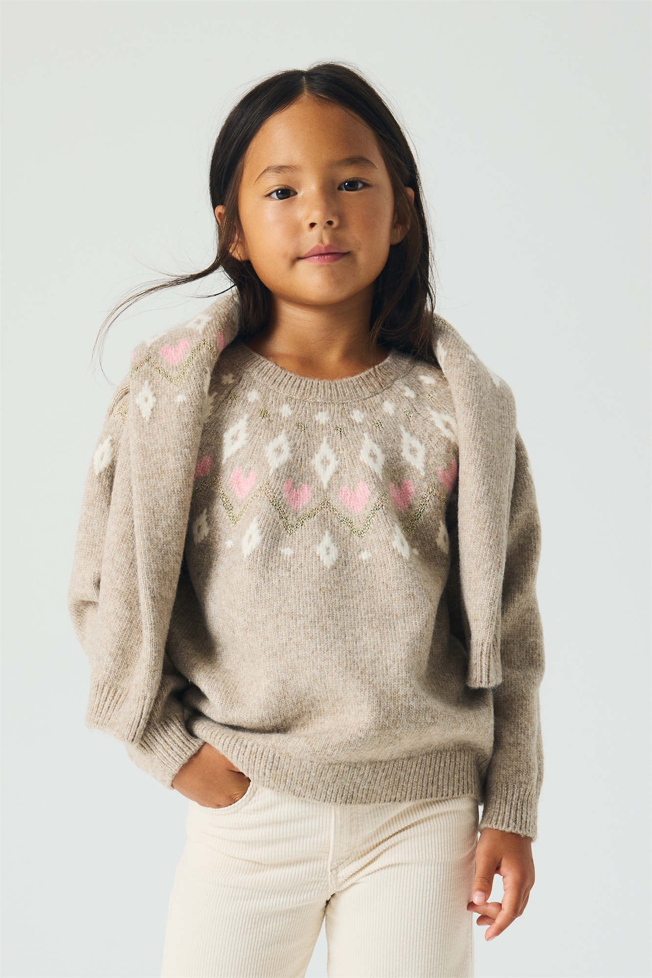 Джемпер из мягкого жаккардового трикотажа с круглым вырезом, отделанным ребрами, длинными рукавами реглан и ребрами на манжетах и подоле.