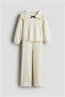 Комплект из топа и брюк из мягкого, тонкого трикотажного хлопка пуателье. Топ с круглым вырезом, воротником "Питер Пэн" с оборками и декоративным атласным бантом спереди. Длинные рукава, манжеты и подол отделаны тесемками. Брюки-дудочки с эластичным поясом, расклешенными ногами и обрезными каймами.