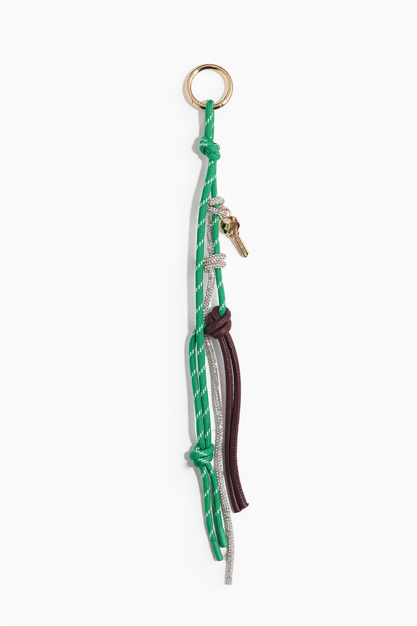 Брелок для сумки сплетен из нескольких узловатых ремешков, один из которых украшен сверкающими стразами. Застежка в виде пружинного кольца легко крепится к сумке или кольцу для ключей.