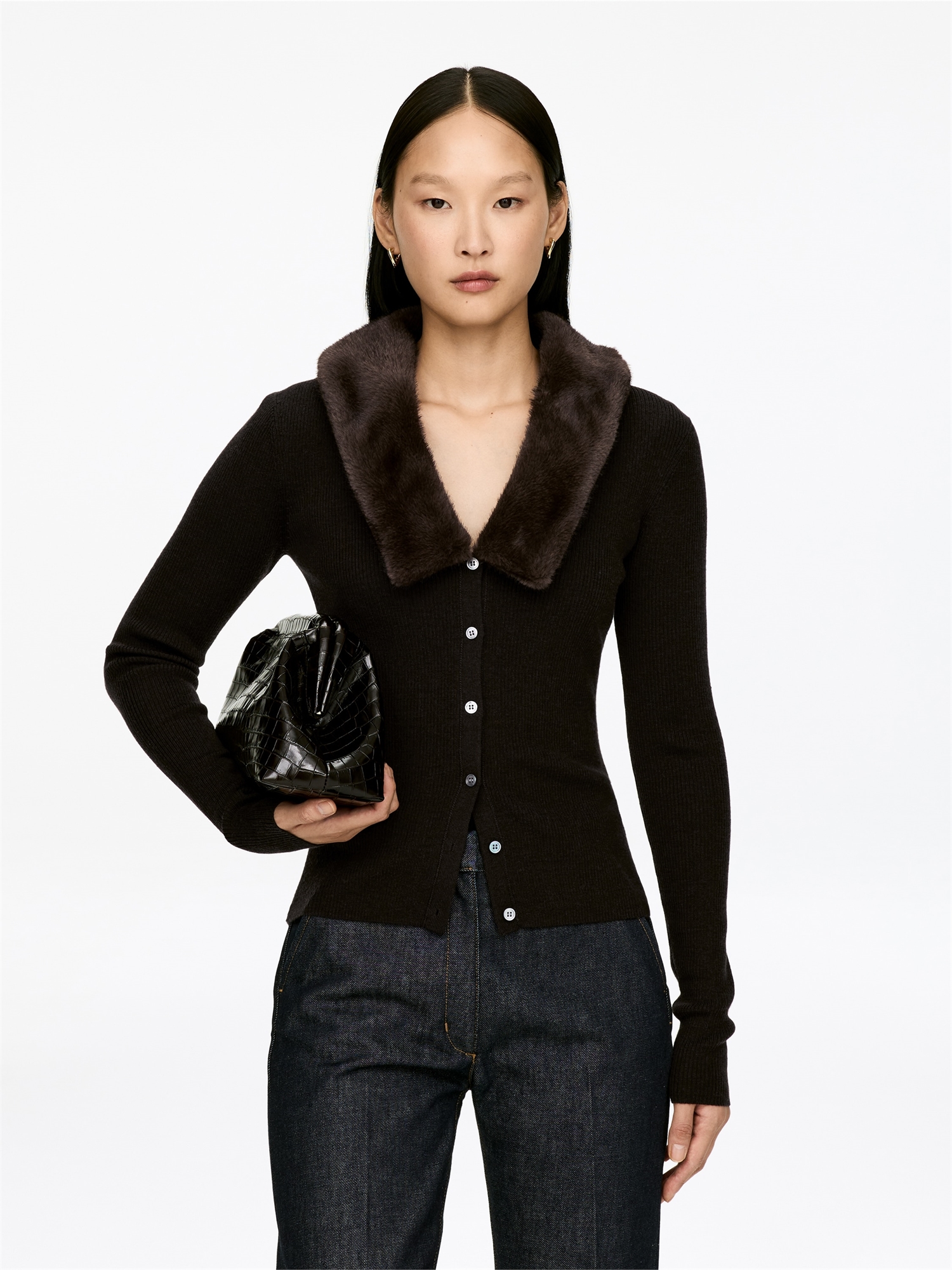 Кардиган из чистой шерсти с воротником из искусственного меха и застежкой на пуговицы.
