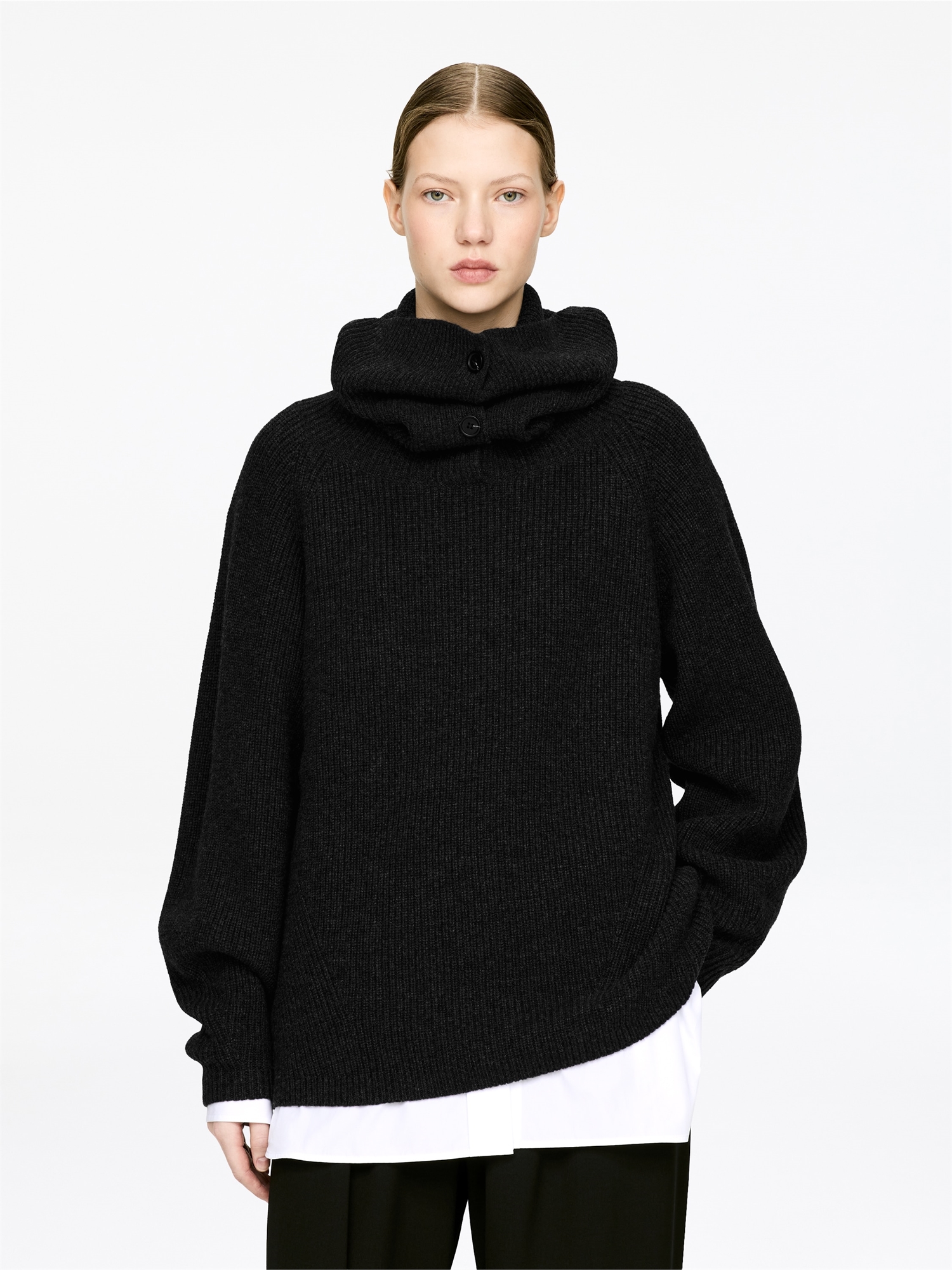 Повседневный джемпер из чистой шерсти с воротником на пуговицах, который можно носить как стойку или отложной воротник. Модель изготовлена из 100% шерсти, сертифицированной по стандарту RWS (TE-00047206). Продукция, сертифицированная в соответствии со стандартом ответственной шерсти (RWS), содержит шерстяные волокна с ферм, прошедших независимую сертификацию в соответствии с требованиями к благополучию животных и землепользованию.
